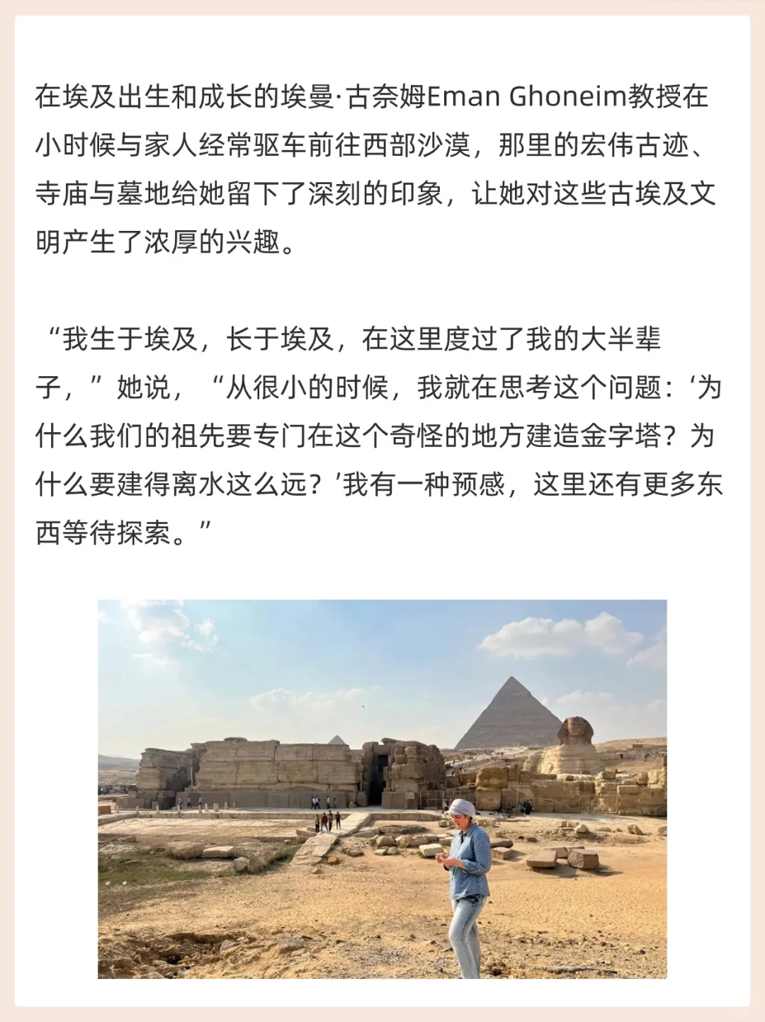美国北卡罗来纳大学威尔明顿分校地貌学教授埃曼·古奈姆(Eman Ghoneim)表示,几年以来,她一直在思考这个古埃及的终极谜团。“我生于埃及,长于埃及,在这里度过了我的大半辈子,”她说,“从很小的时候,我就在思考这个问题:‘为什么我们的祖先要专门在这个奇怪的地方建造金字塔?为什么要建得离水这么远?’我有一种预感,这里还有更多东西等待探索。”