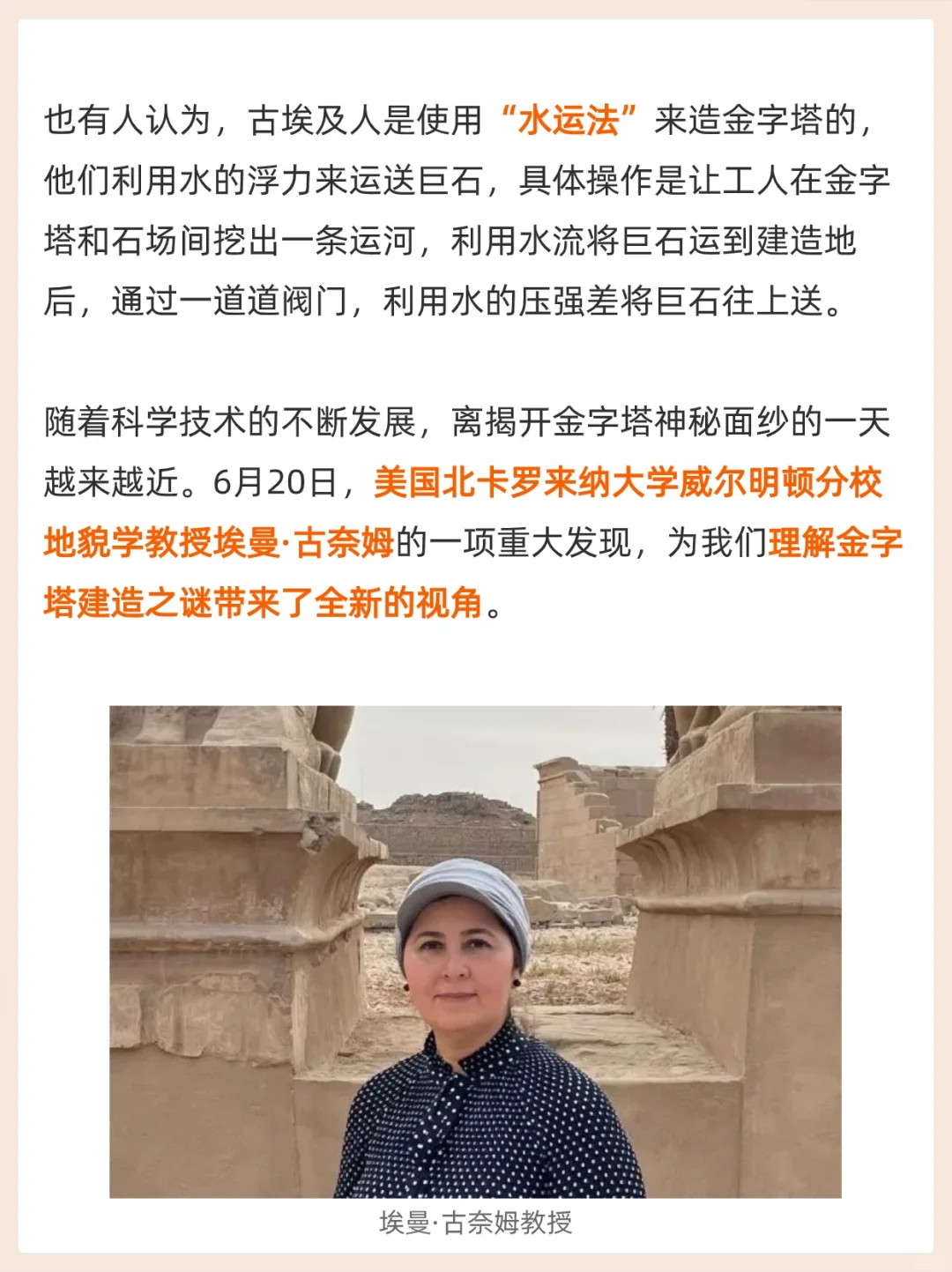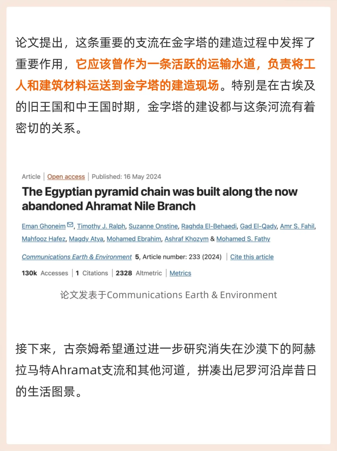 古奈姆表示,他们将这条支流命名为“阿赫拉马特”(Ahramat,阿拉伯语中意为“金字塔”),金字塔的建造者很可能曾利用这条支流运输建筑材料。