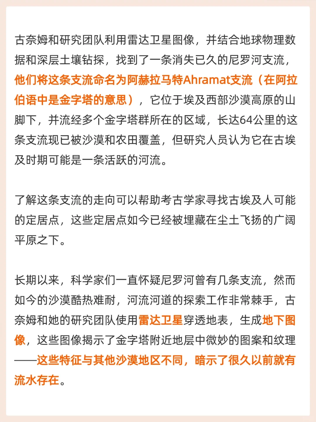 了解这条支流的走向可以帮助考古学家寻找古埃及人可能的定居点,这些定居点如今已经被埋藏在尘土飞扬的广阔平原之下。相关论文已发表于《通讯·地球与环境》(Communications Earth & Environment)杂志。