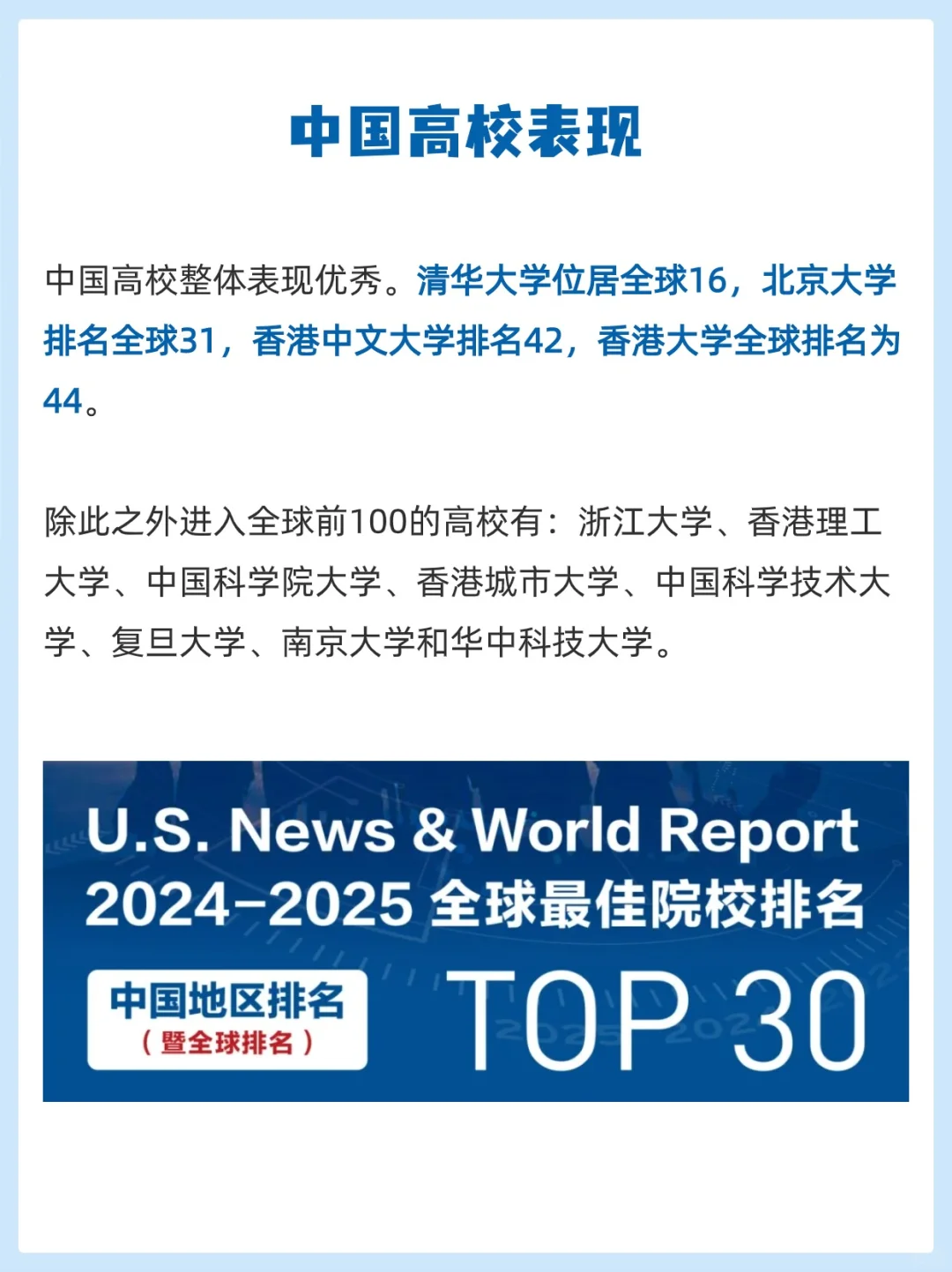 👉在前50名高校中,清华大学位列第16位,北京大学位列第31位,香港中文大学位列第42位,香港大学位居第44位。