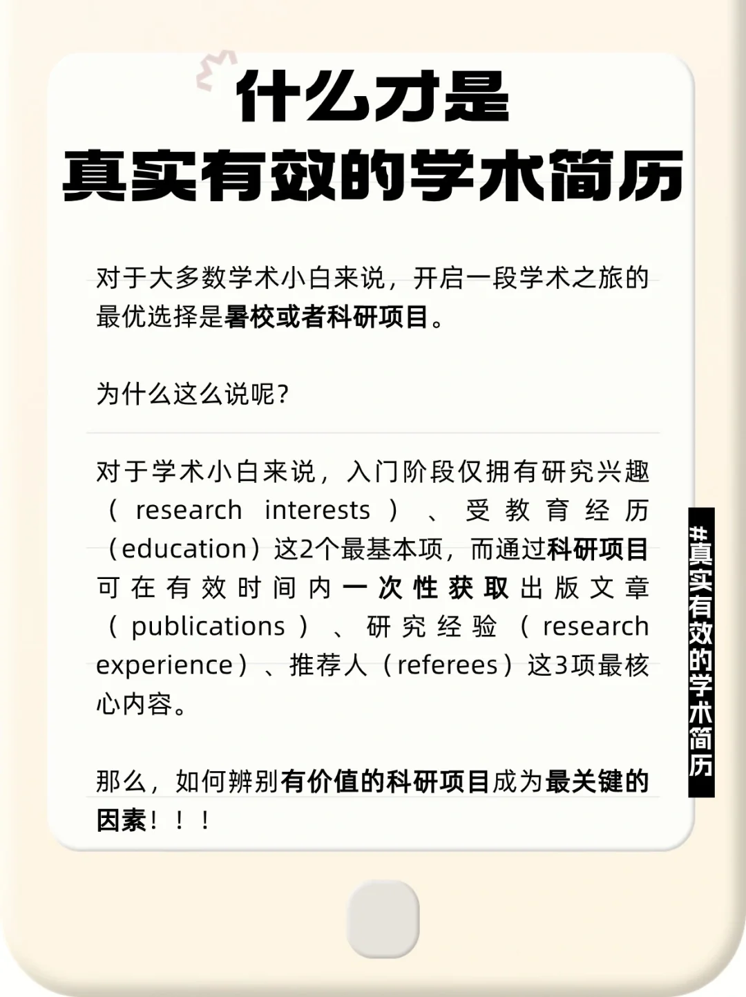 对于学术小白来说,入门阶段仅拥有研究兴趣(research interests)、受教育经历(education)这2个最基本项,通过科研项目可在有效时间内一次性获取出版文章(publications)、研究经验(research experience)、推荐人(referees)这3项最核心内容。