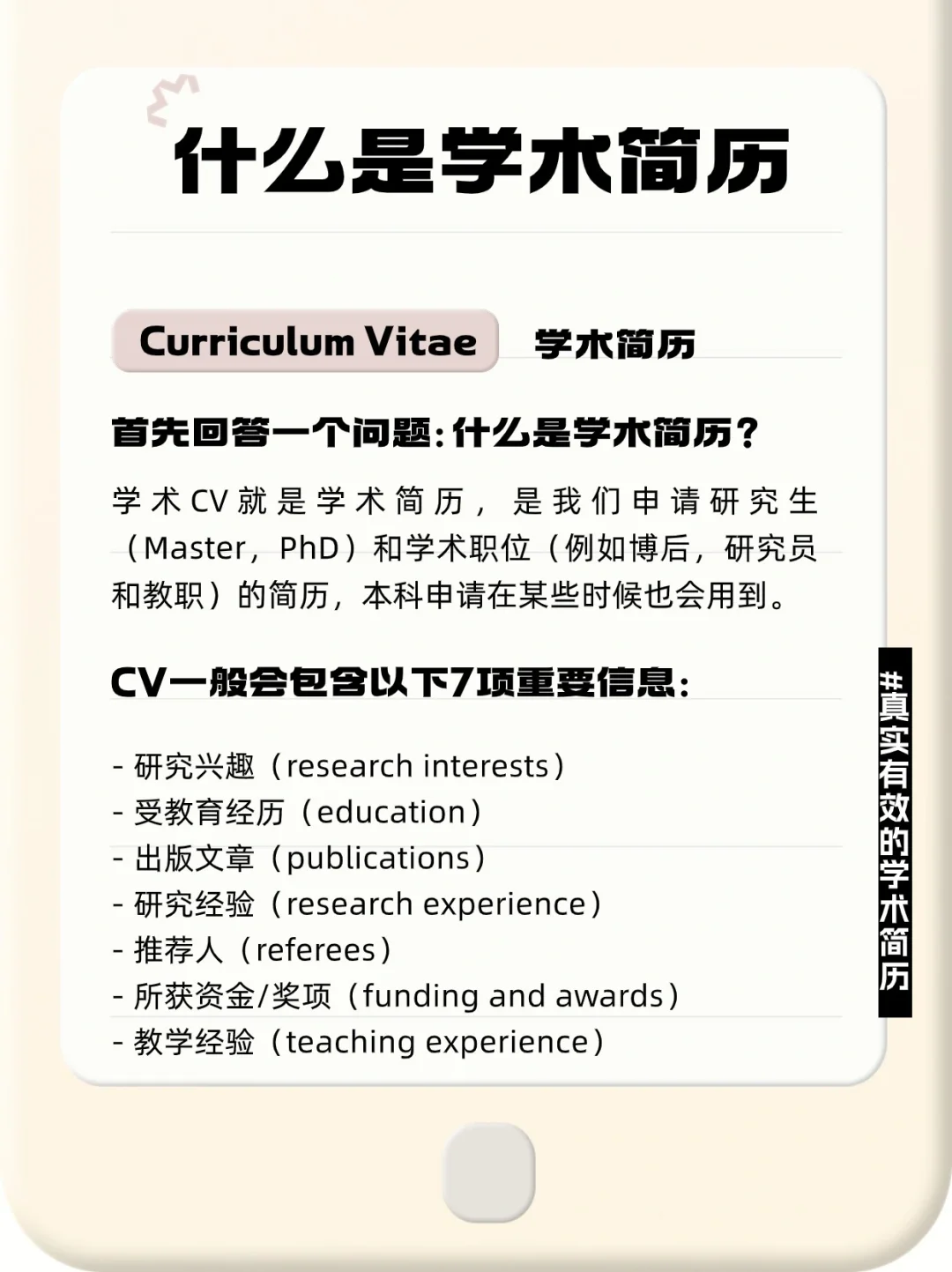 CV,也就是个人简历 Curriculum Vitae。是套磁、申请的时候导师及学校判断你学术能力的敲门砖,一份好的学术CV可以让导师收到后对你眼前一亮[哇R][哇R][哇R]。