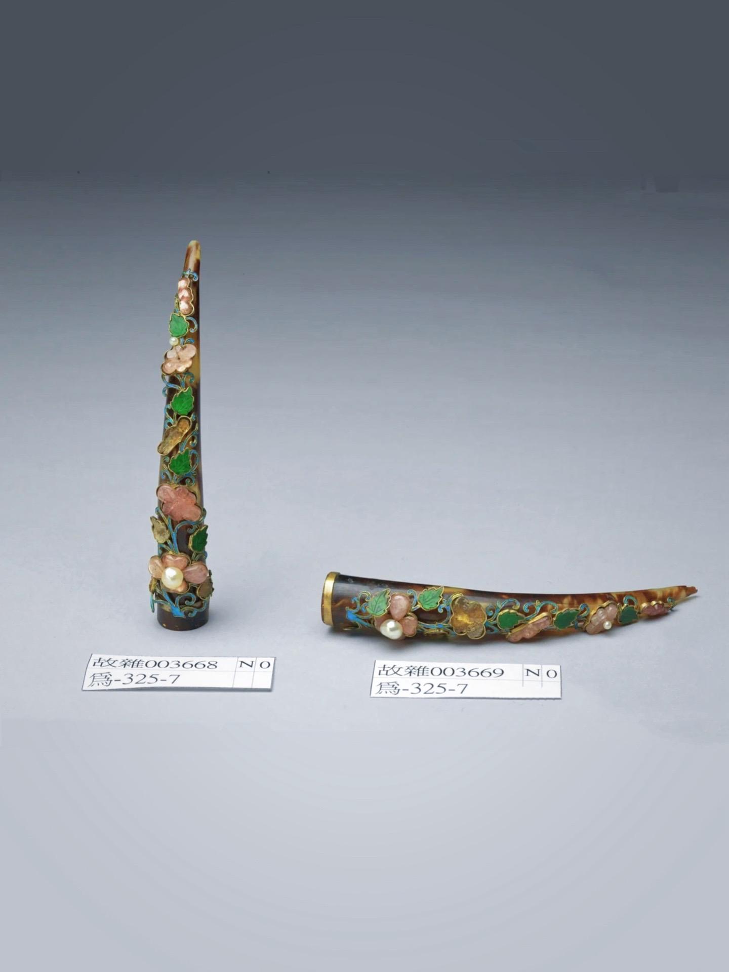 此玳瑁护甲长10厘米、开口直径1.5厘米,镀金座上镶粉红碧玺葵花、翠玉叶及点翠缠枝,背镂雕古钱纹两组,台北故宫博物院藏(故杂3630~3631)