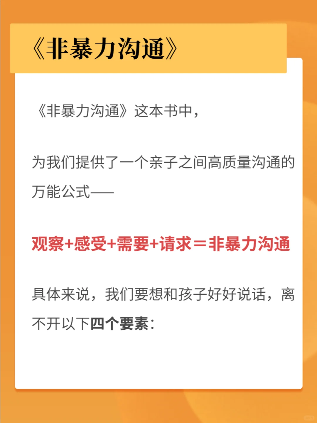 🔹非暴力沟通的核心是理解和尊重。我们需要理解孩子的需要,尊重他们的情感。在沟通时,我们要避免用负面的语言,例如责备、批评、威胁等,而是用积极的、建设性的语言来表达我们的想法和感受。🔹
