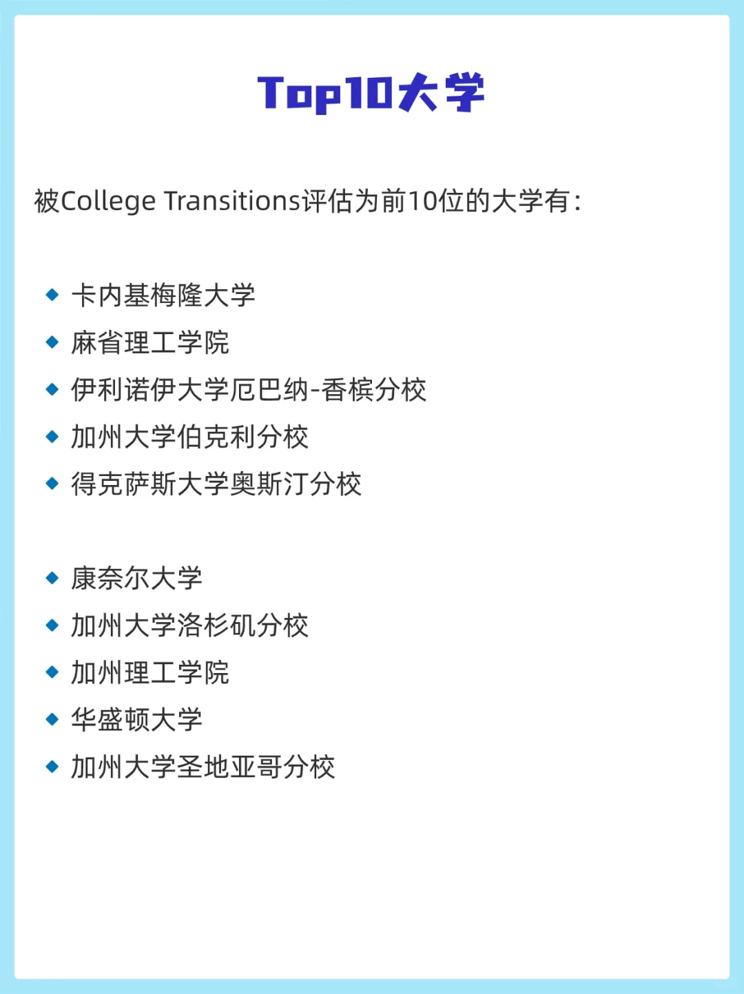 被College Transitions评估为前10位的大学有: