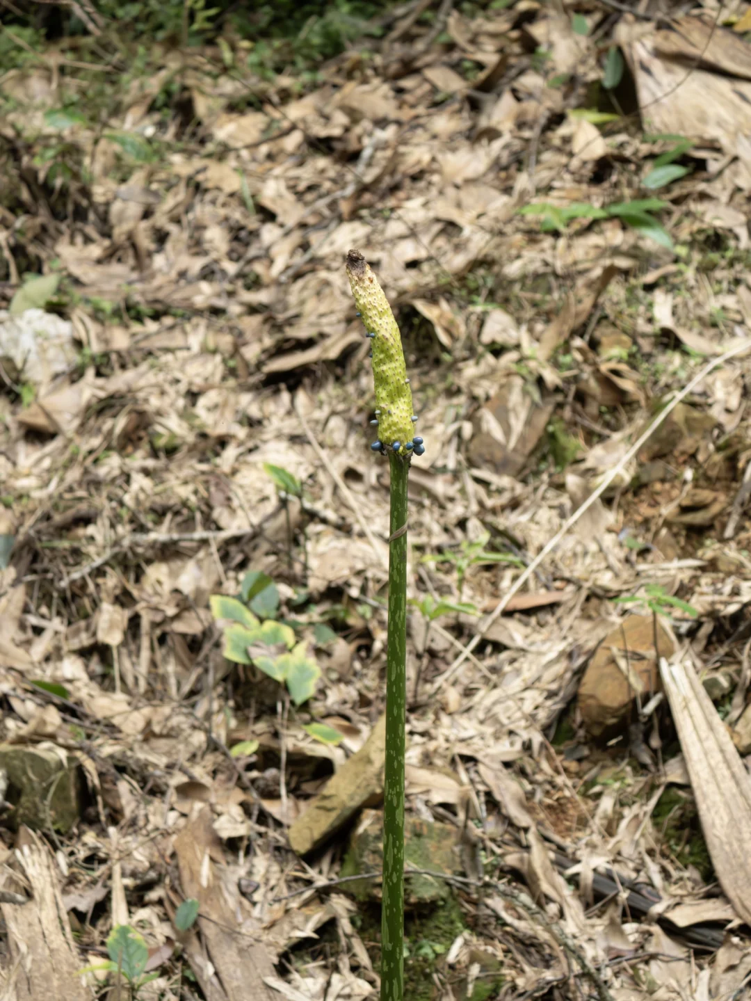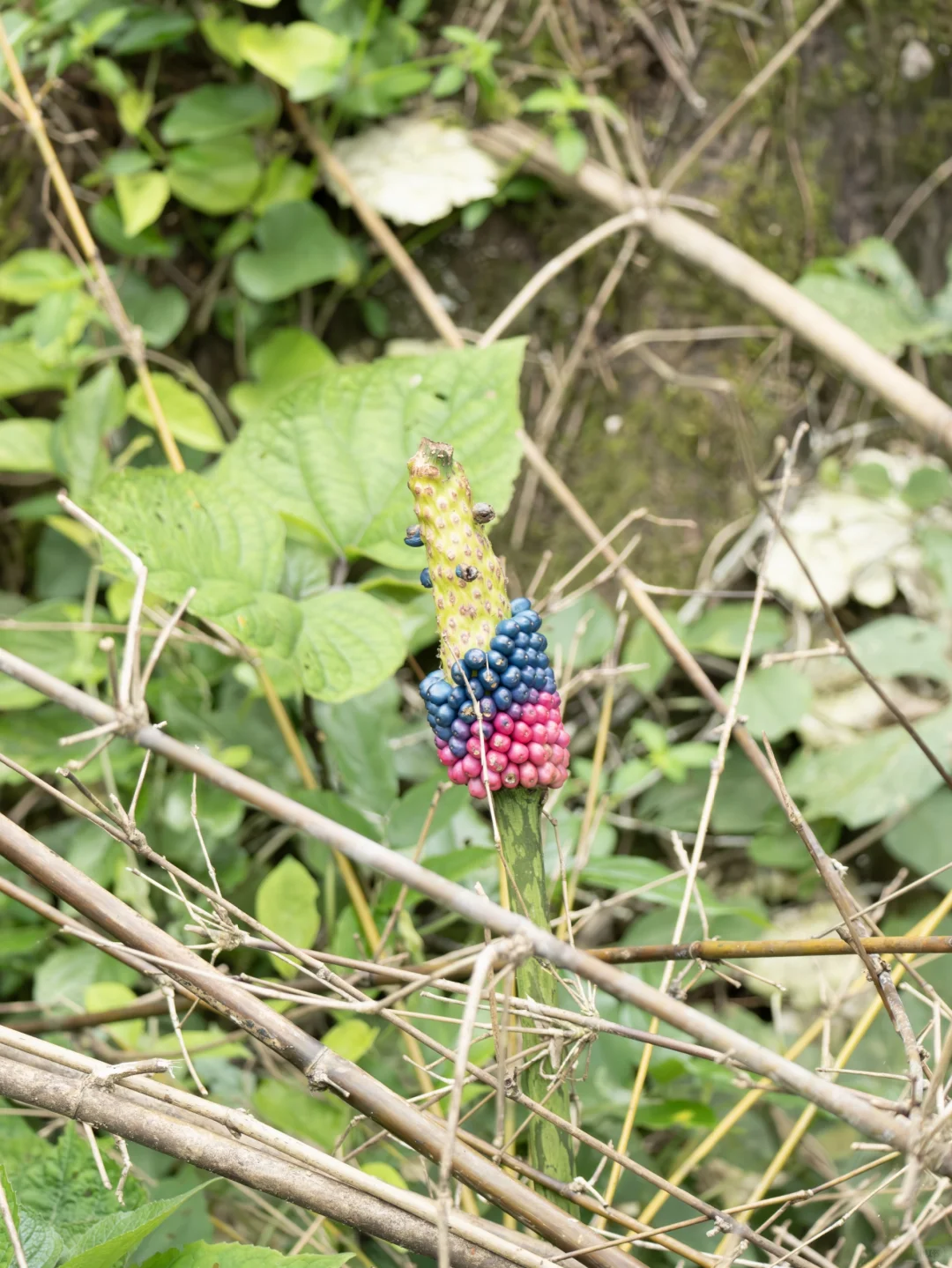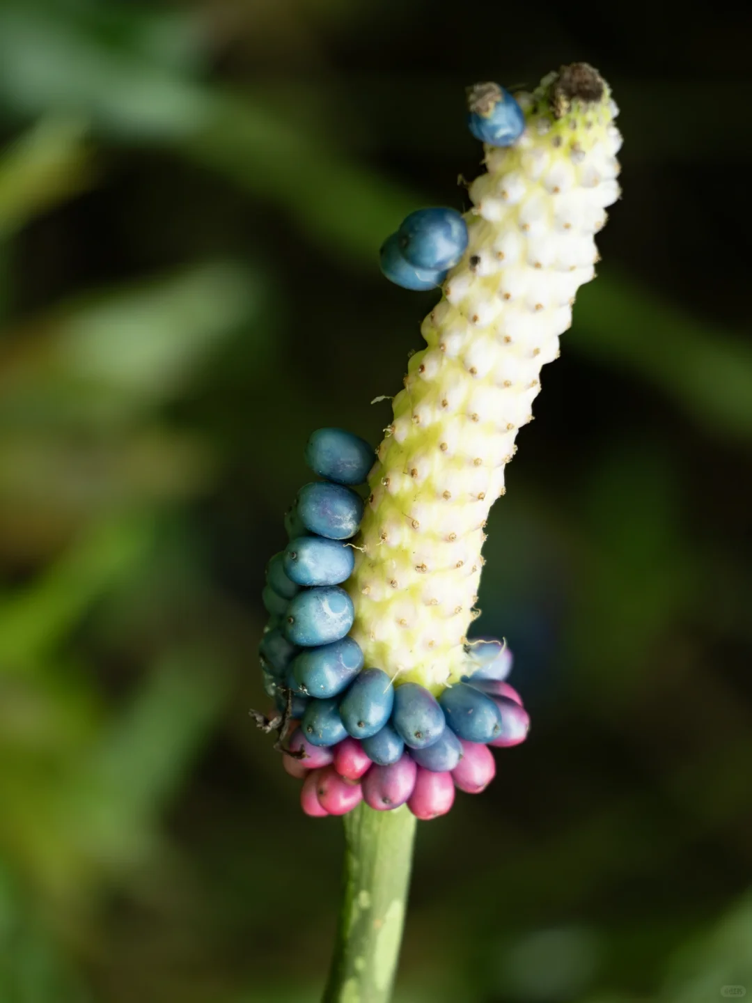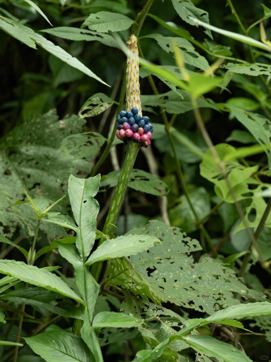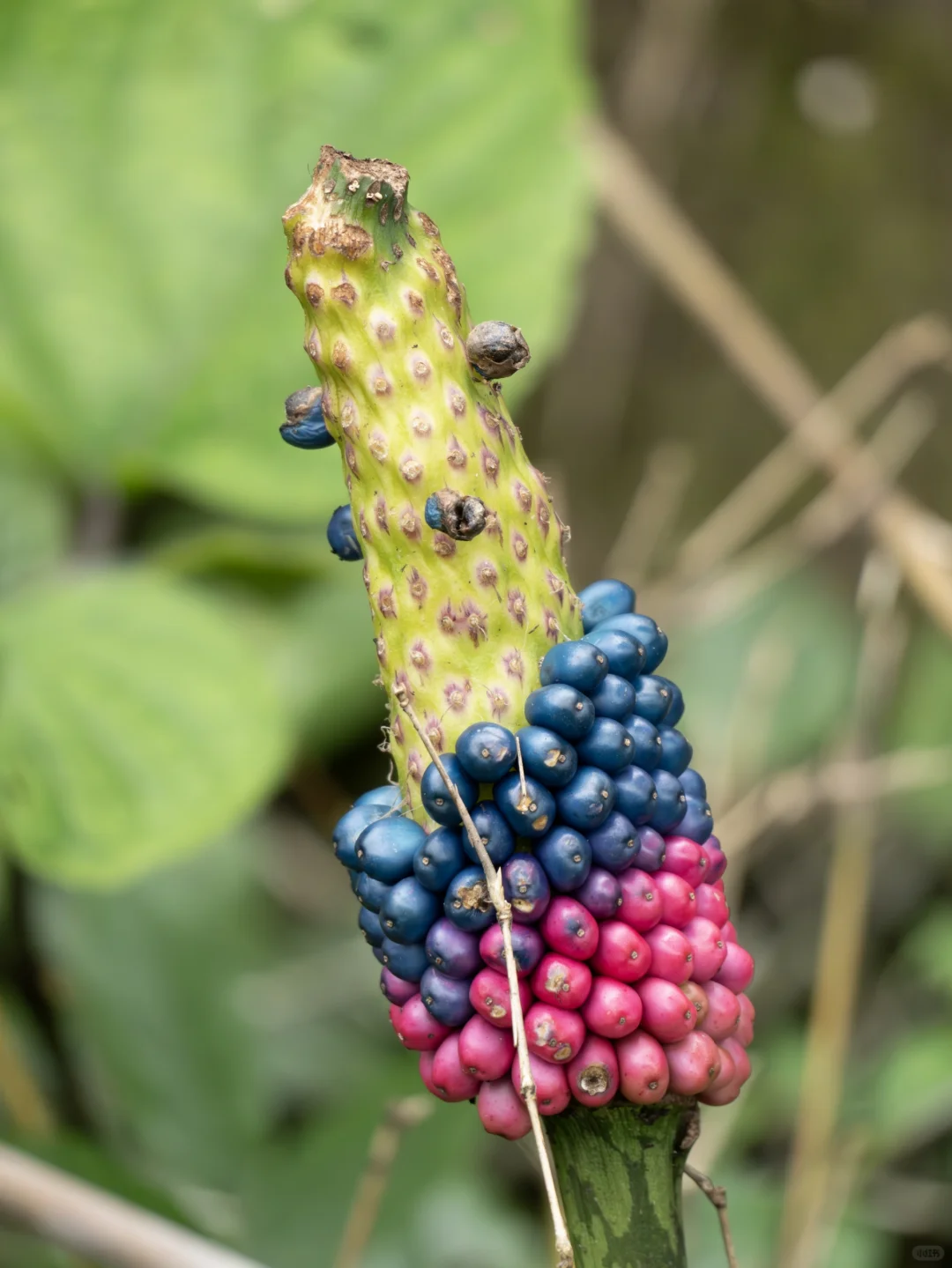 几天前在福建明溪参加鸟赛时,我在乡野间和森林里总能看到已经成熟的东亚魔芋果实。深蓝色和浅紫色的果实像渐变的画笔,将整个果序点缀得异常炫目。那些天遇到的东亚魔芋,很多都已经被鸟儿啄食,只剩下底部的一小部分果实。