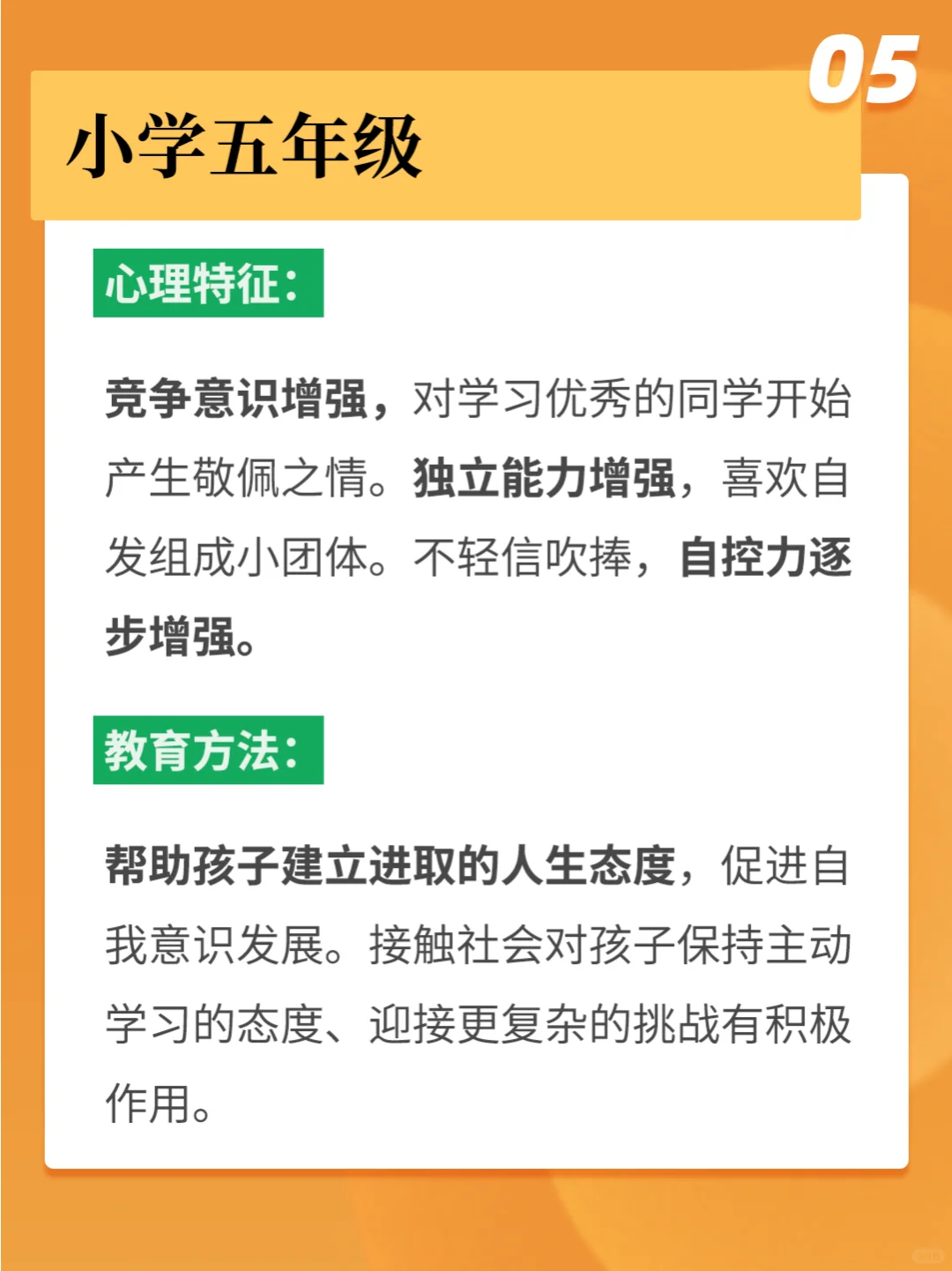 竞争意识增强🏁,对学习优秀的同学开始产生敬佩之情💖。独立能力增强,喜欢自发组成小团体👭。不轻信吹捧,自控力逐步增强💪。