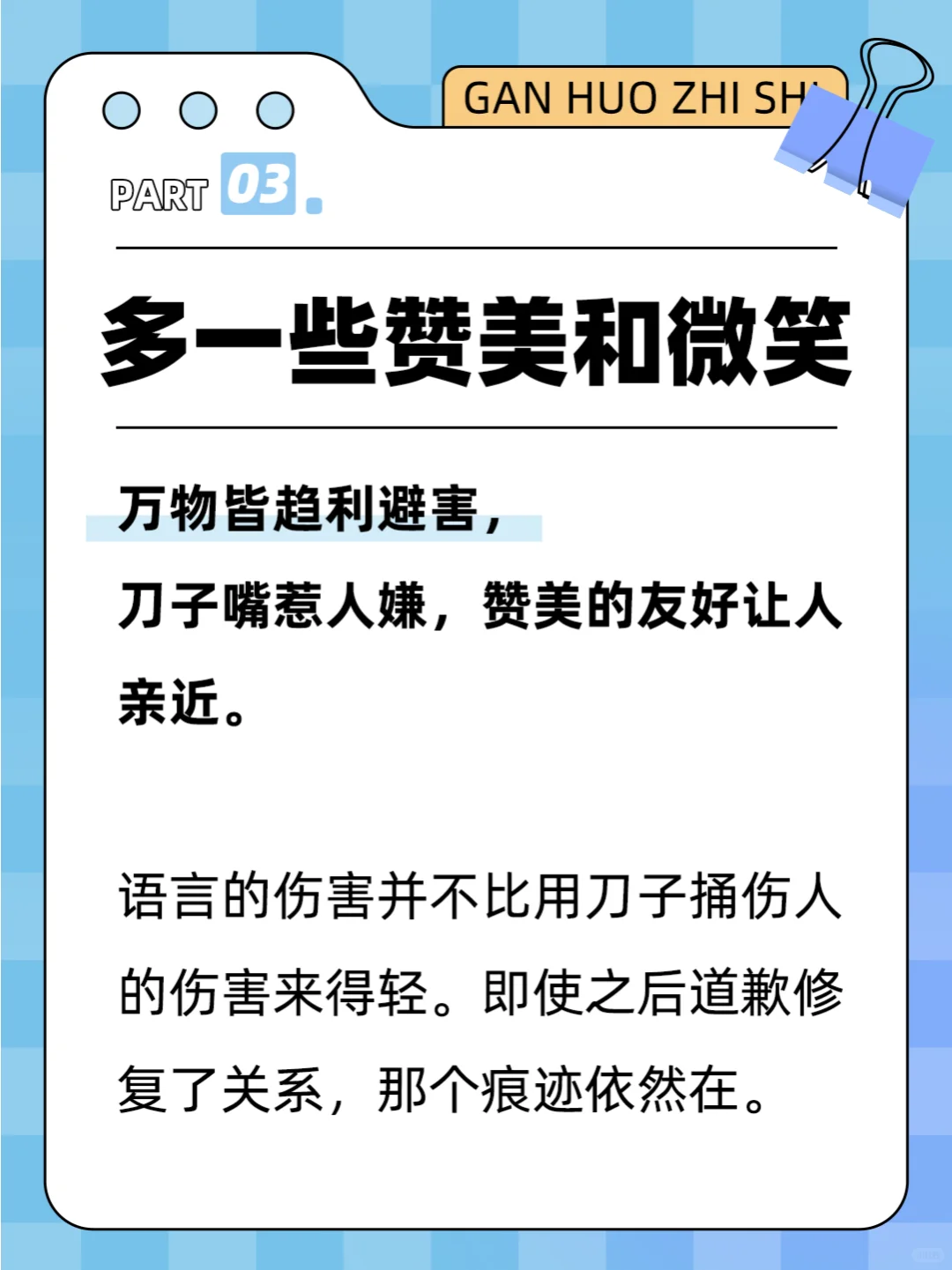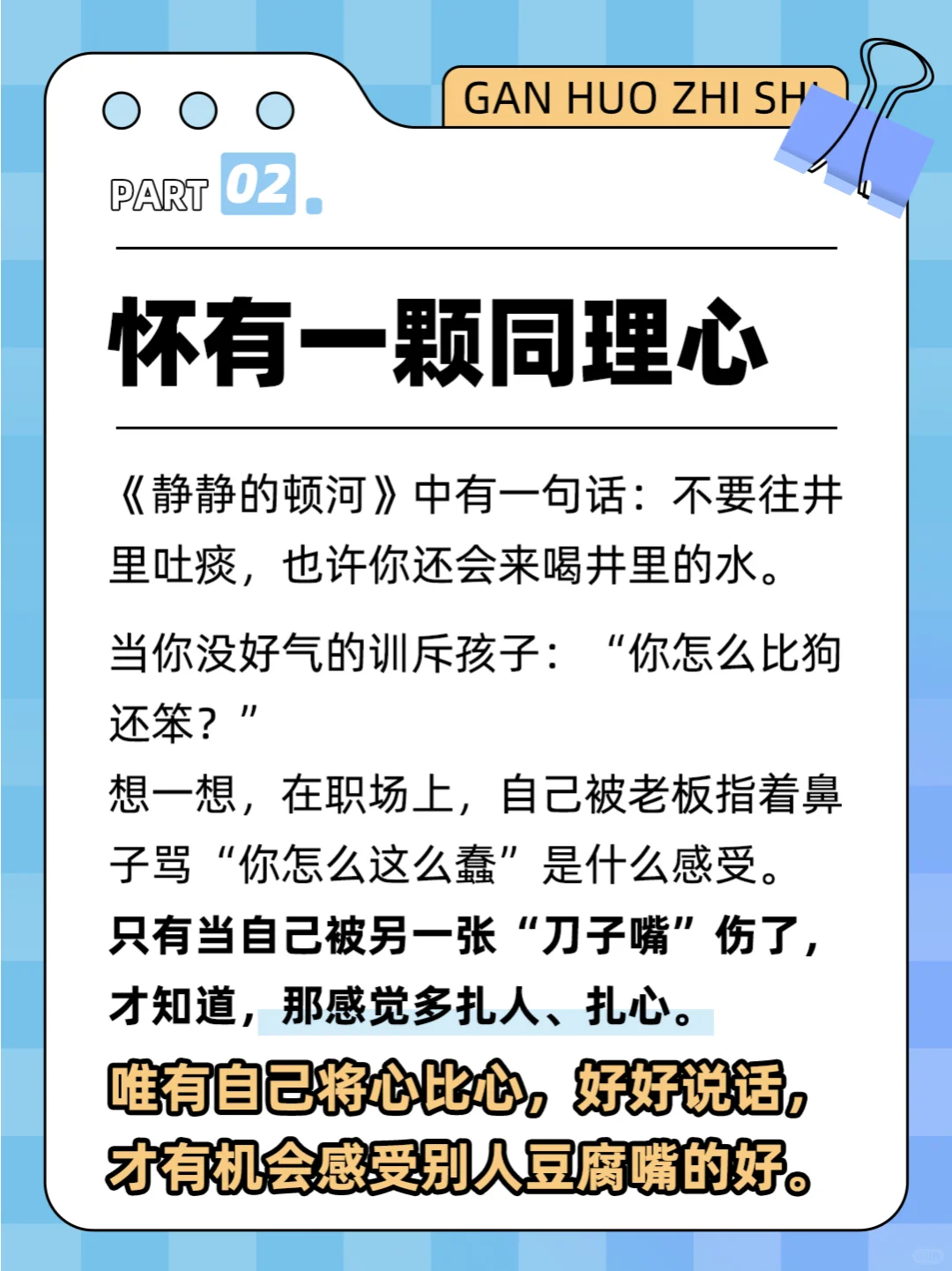 毕淑敏说:“婚姻的本质是一种生长缓慢的植物,需要不断浇灌,加施肥料,修枝理叶,打杀害虫,才有持久的绿荫。”🌱🌳 无论对待伴侣,还是对待孩子。我们都要拒绝刀子嘴豆腐心,好好说话。🙅♀️🙅♂️ 1️⃣以真实的自己示人👤 2️⃣怀有一颗同理心💖 3️⃣多一些赞美和微笑😊 比起“刀子嘴豆腐心”,温和的表面、刚毅的内在更值得人尊重。💪👏