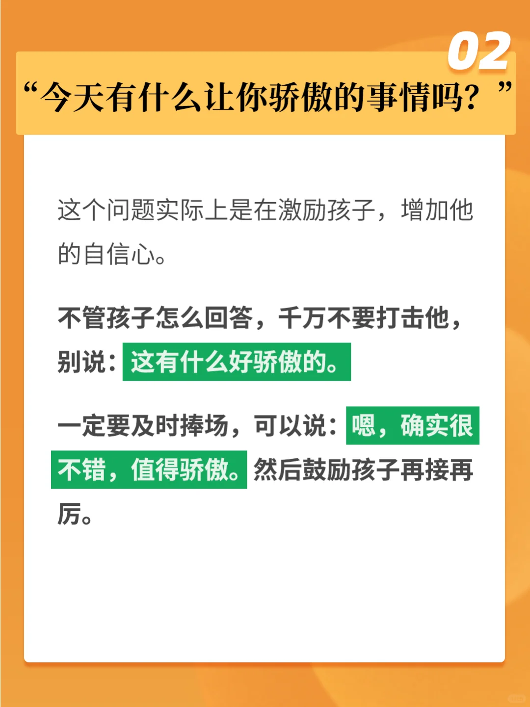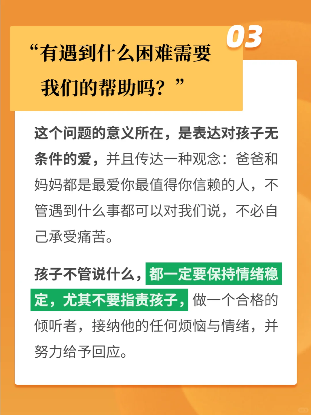 孩子的内心都渴望着父母真诚的关爱。💖 孩子在学校也累了一天,如果父母一见面就只关心学习,会给孩子一种只在乎成绩的感觉,心里自然会不痛快。😔 建议父母第一句话可以这样说: 1️⃣“今天学校有什么开心的事吗?”😄 2️⃣“今天有什么让你骄傲的事情吗?”🏆 3️⃣有遇到什么困难需要我们的帮助吗?”🙋♀️ 良好的沟通,温柔的关怀,会给亲子沟通打下良好的的基础,并且在孩子心中设立起一座坚固的避风港,逐渐建立亲密的亲子联结。👨👩👧👦💕