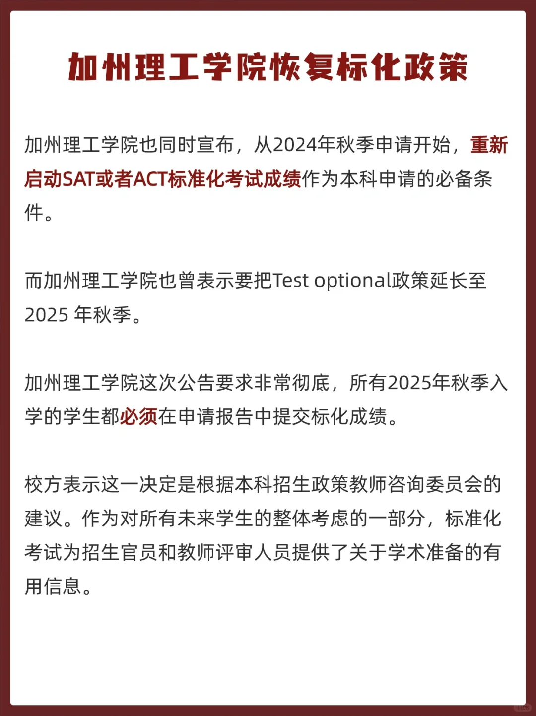 加州理工学院也同时宣布,从2024年秋季申请开始,重新启动SAT或者ACT标准化考试成绩作为本科申请的必备条件。即所有于 2025 年秋季入学的学生都必须在申请中报告标化测试成绩。