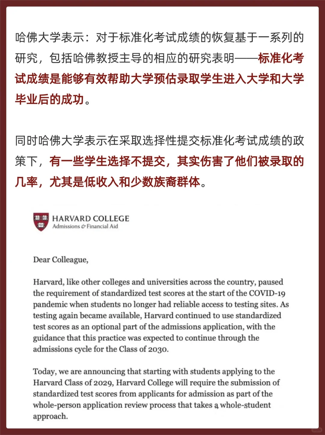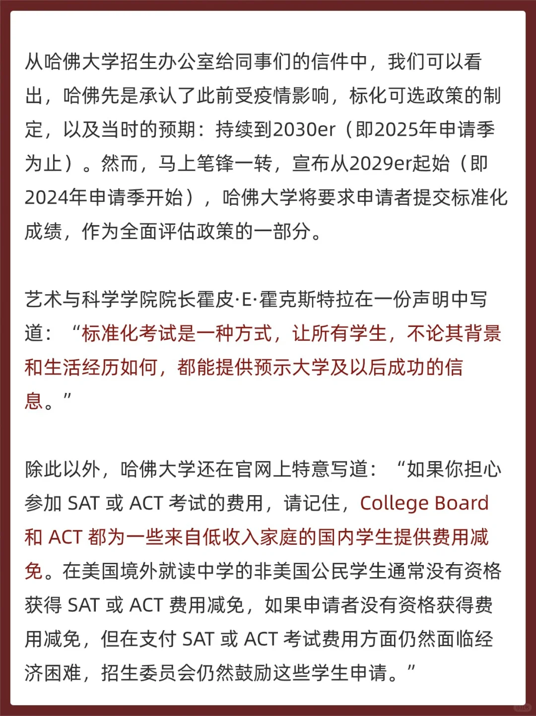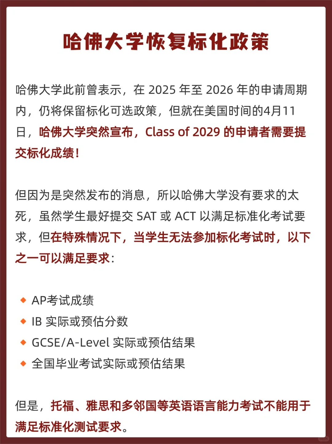 哈佛大学此前曾表示,在 2025 年至 2026 年的申请周期内,仍将保留标化可选政策,但就在美国时间的本周四,哈佛大学突然宣布,Class of 2029 的申请者需要提交标化成绩!
