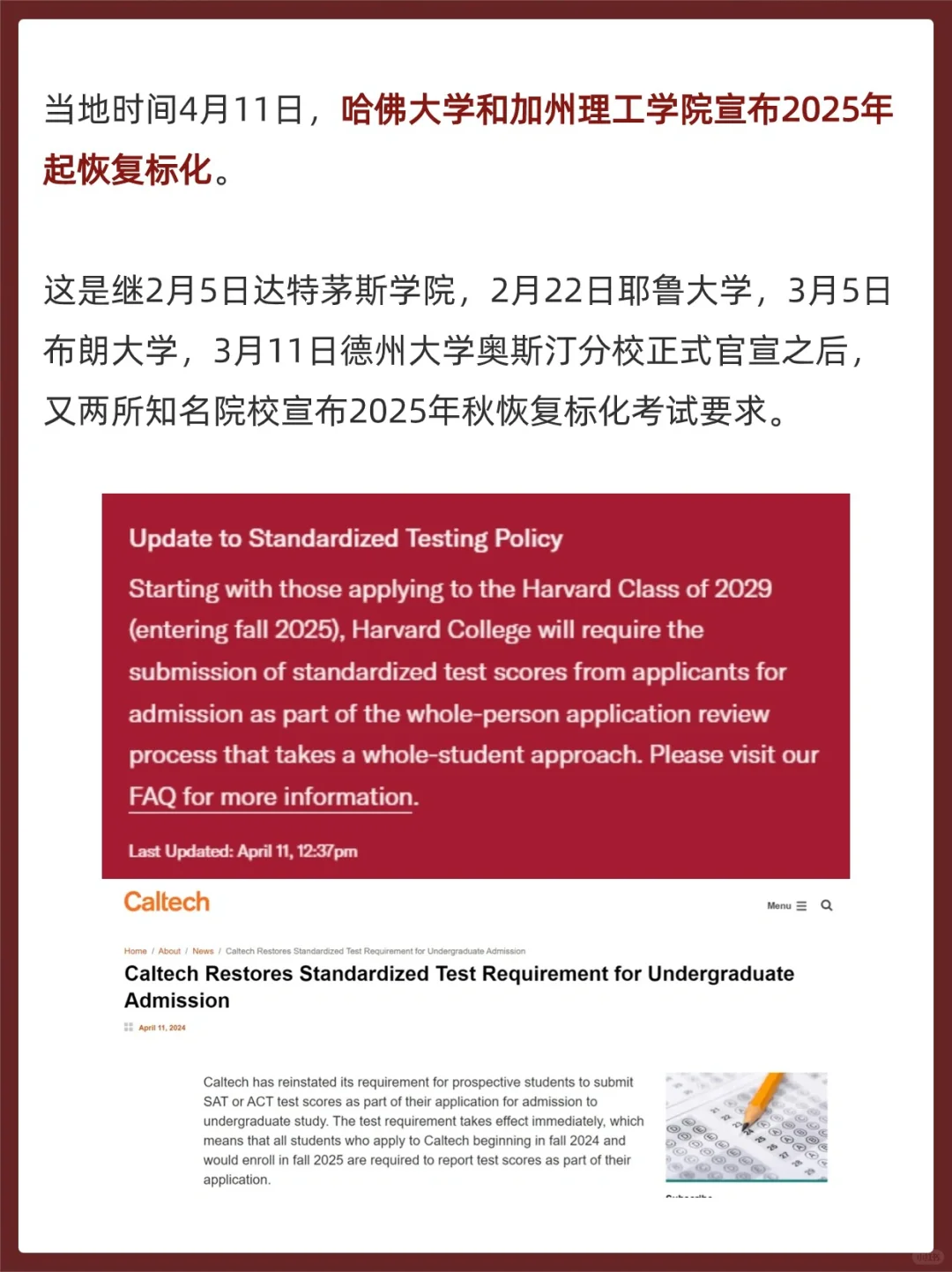 当地时间4月11日,哈佛大学和加州理工学院宣布2025年起恢复标化。这是继2月5日达特茅斯学院,2月22日耶鲁大学,3月5日布朗大学,3月11日德州大学奥斯汀分校正式官宣之后,又两所知名院校宣布2025年秋恢复标化考试要求。