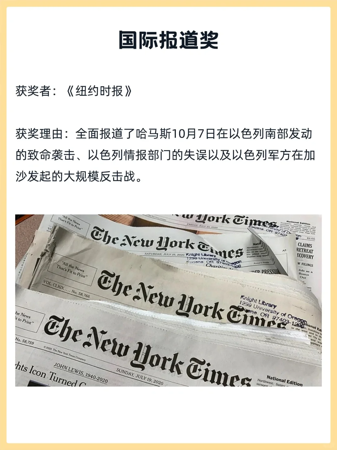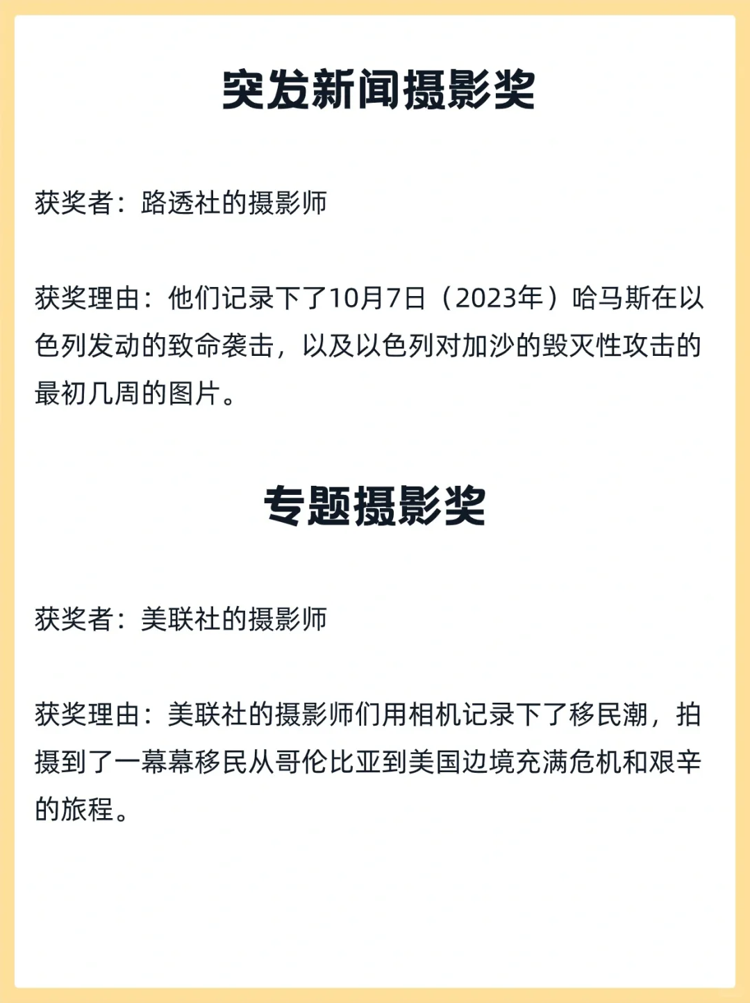 内容上来看,巴以冲突多次被提及,也有关于移民、童工、洪水泥石流灾害等多个不同领域的新闻报道获奖。