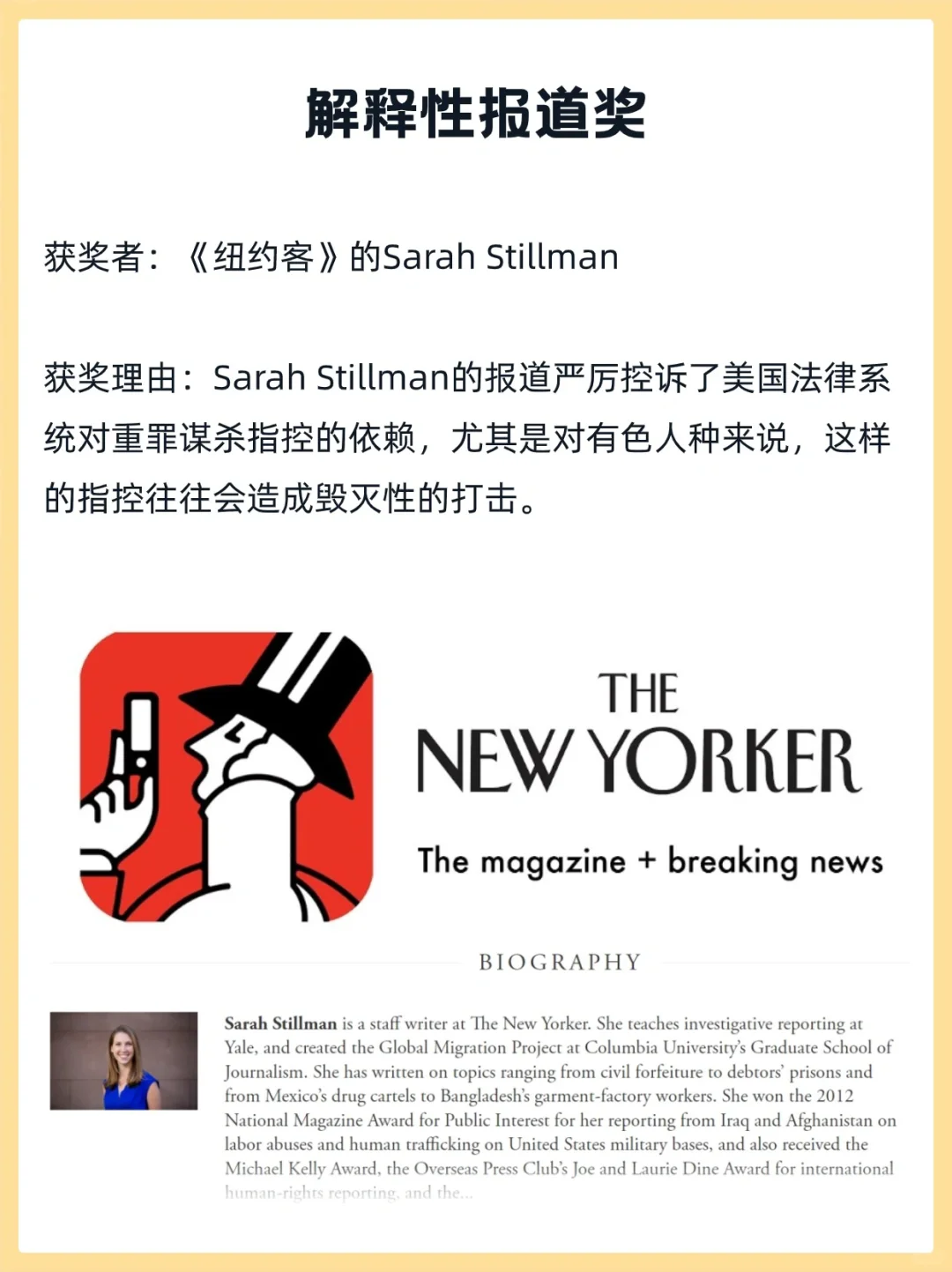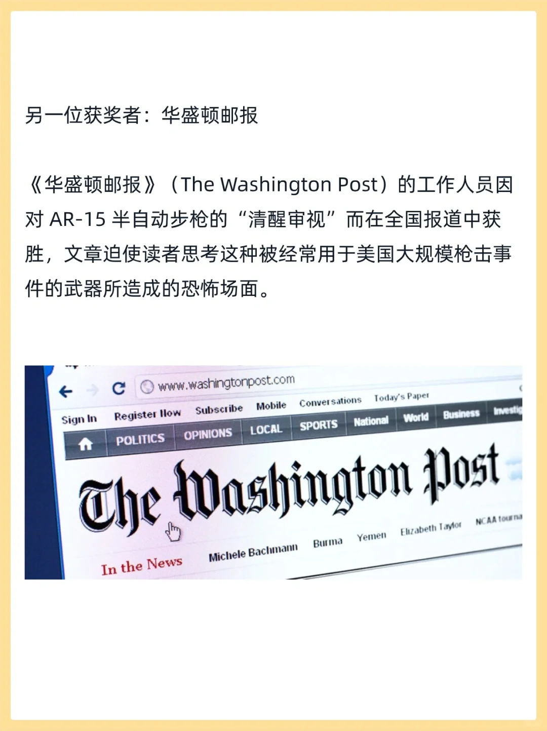 从获奖者所属来看,《纽约时报》、《华盛顿邮报》成为赢家,分别获得三项大奖,路透社、纽约客等知名的新闻媒体也都成功上榜。
