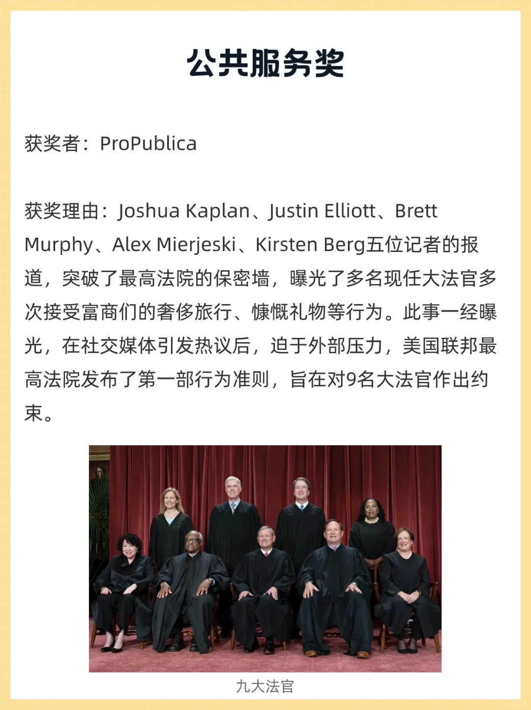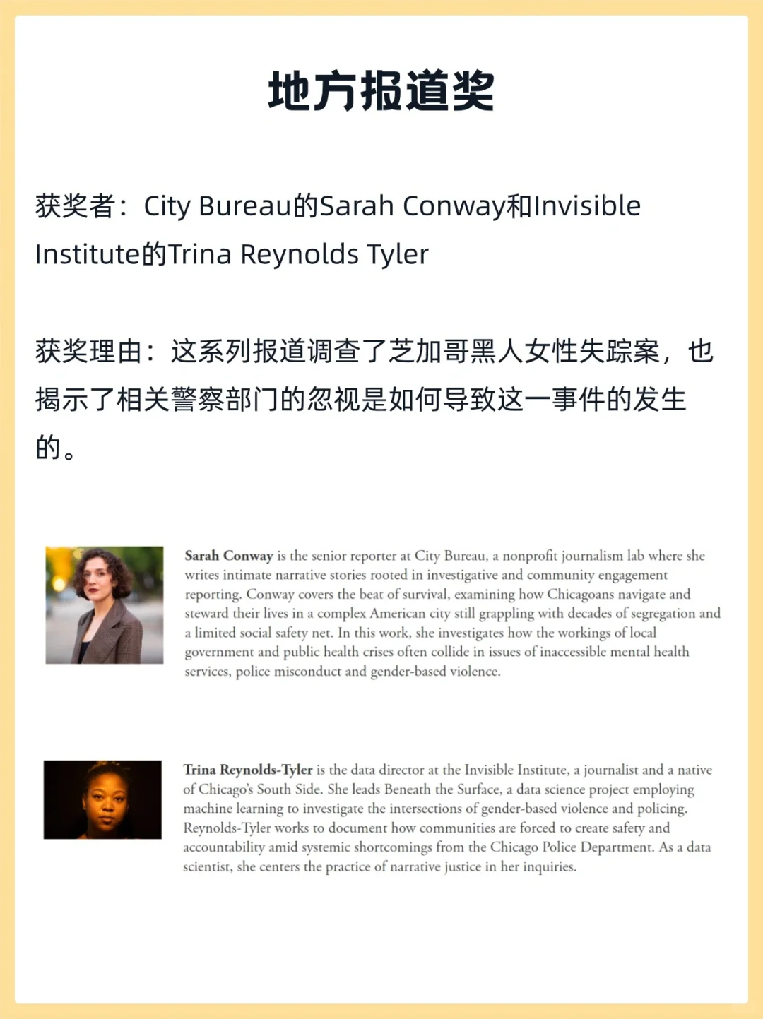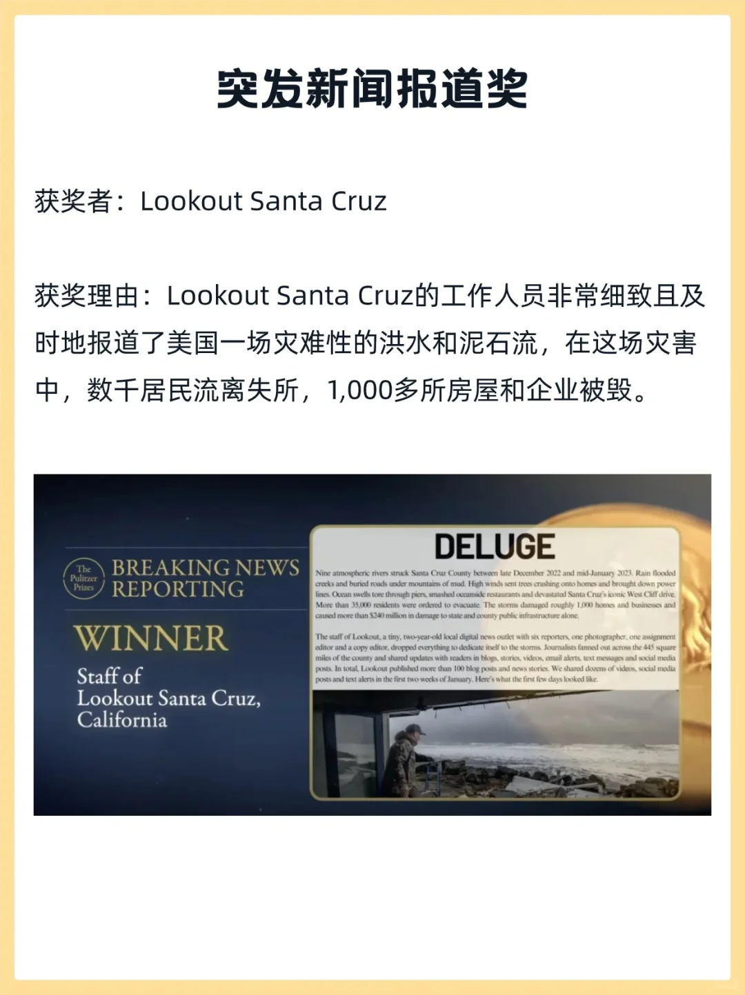 其中,新闻类公共服务获奖者获得普利策金牌,所有其他获奖者获得 15,000 美元奖金。