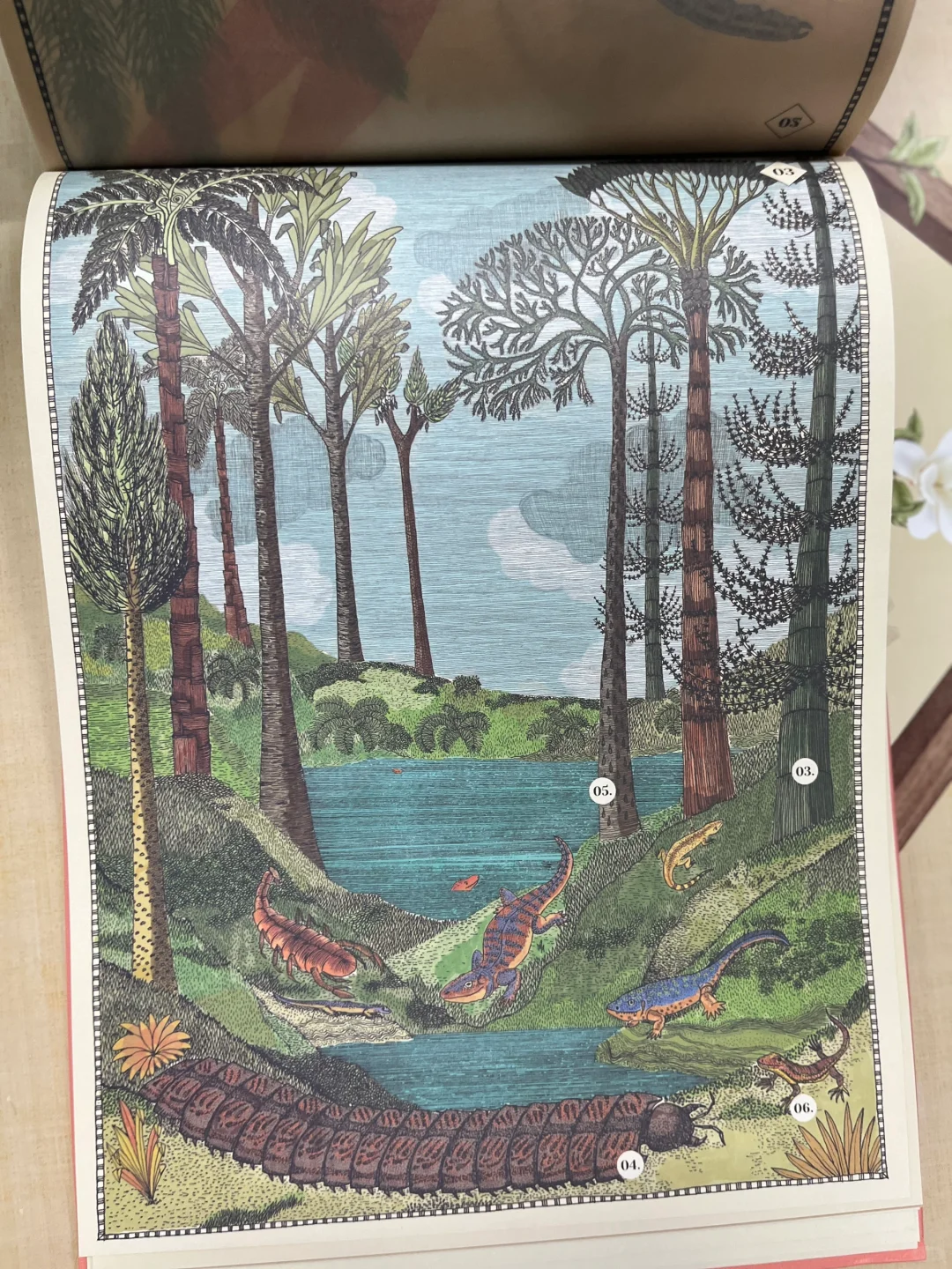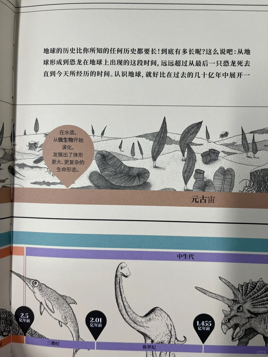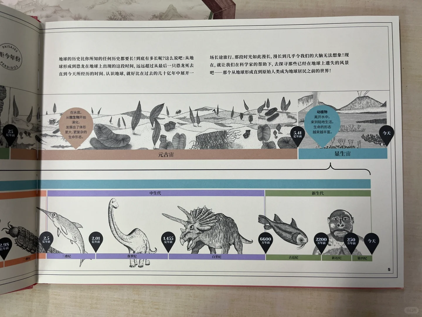 而西班牙插画家艾娜·贝斯塔德就以46亿年的地球历史为主题创作了这本科普绘本,带领读者一起穿越远古的尘封,探寻那些已经在地球上遗失的风景,感受时间的力量。