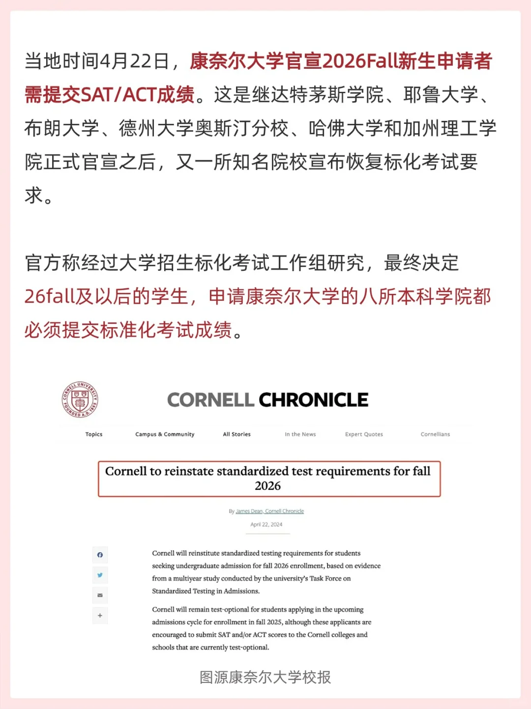当地时间4月22日,康奈尔大学官宣2026Fall新生申请者需提交SAT/ACT成绩。这是继达特茅斯学院、耶鲁大学、布朗大学、德州大学奥斯汀分校、哈佛大学和加州理工学院正式官宣之后,又一所知名院校宣布恢复标化考试要求。