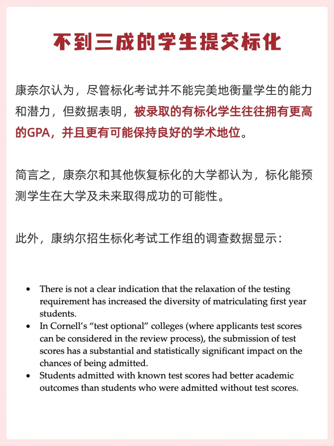 官方称经过大学招生标化考试工作组研究,最终决定26fall及以后的学生,申请康奈尔大学的八所本科学院都必须提交标准化考试成绩。