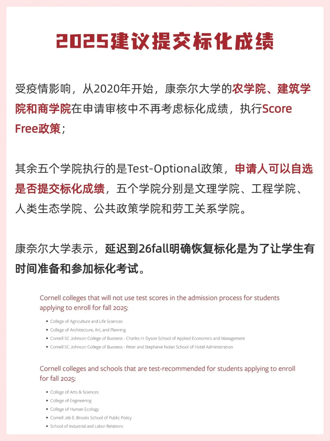 而对于在即将到来的2025年秋季入学周期中申请的学生,康奈尔大学的文理学院、工程学院、人类生态学院、公共政策学院,及劳工关系学院仍保持标化可选政策;而农学院、建筑学院、商学院,则是免标化政策。