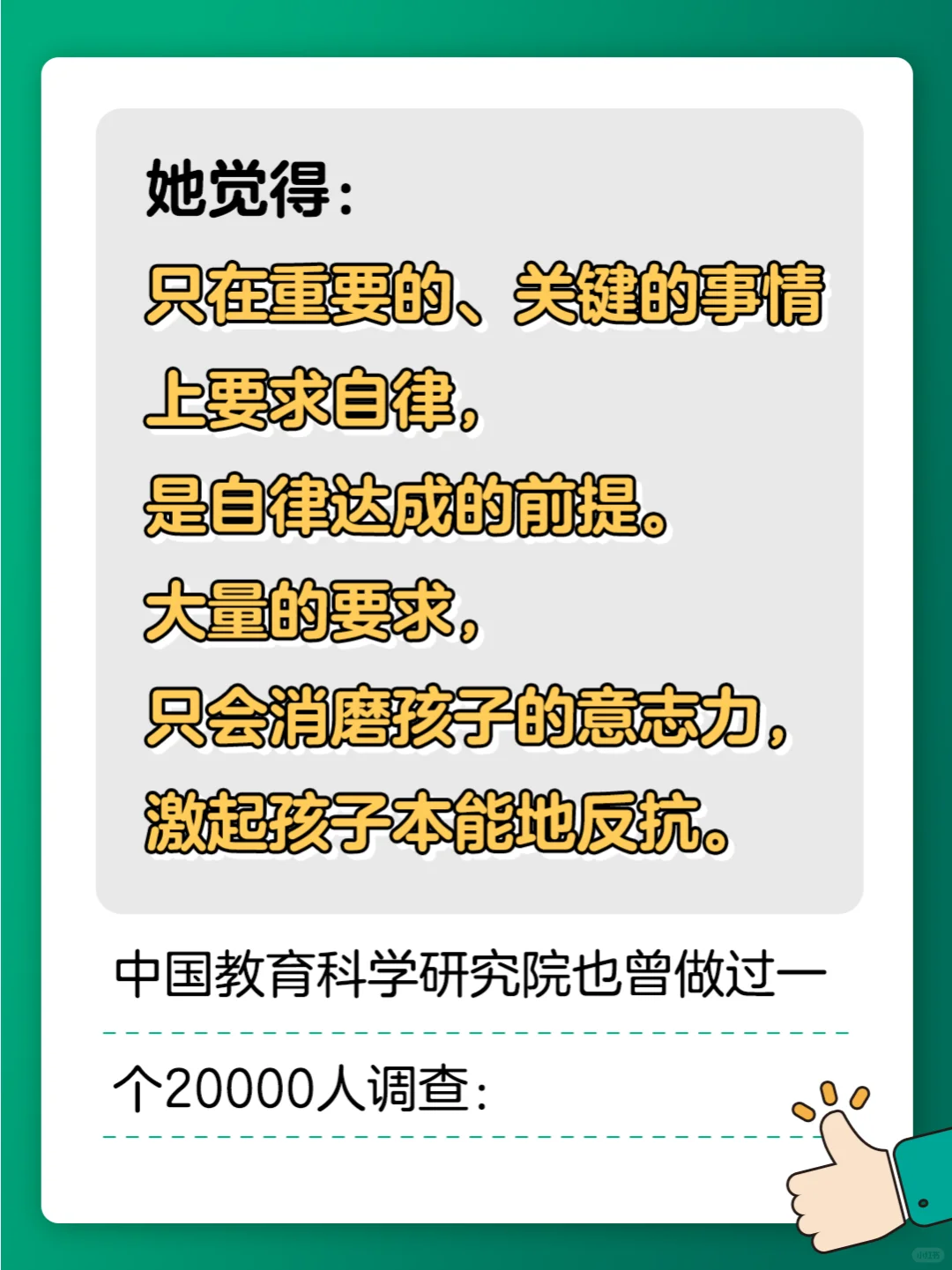 她觉得:只在重要的、关键的事情上要求自律,是自律达成的前提。大量的要求,只会消磨孩子的意志力,激起孩子本能地反抗。💪