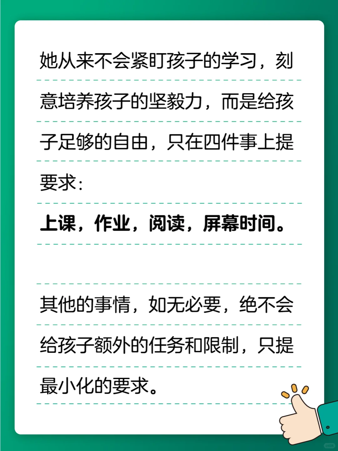 她从来不会紧盯孩子的学习,刻意培养孩子的坚毅力,而是给孩子足够的自由,只在四件事上提要求:上课,作业,阅读,屏幕时间。📝