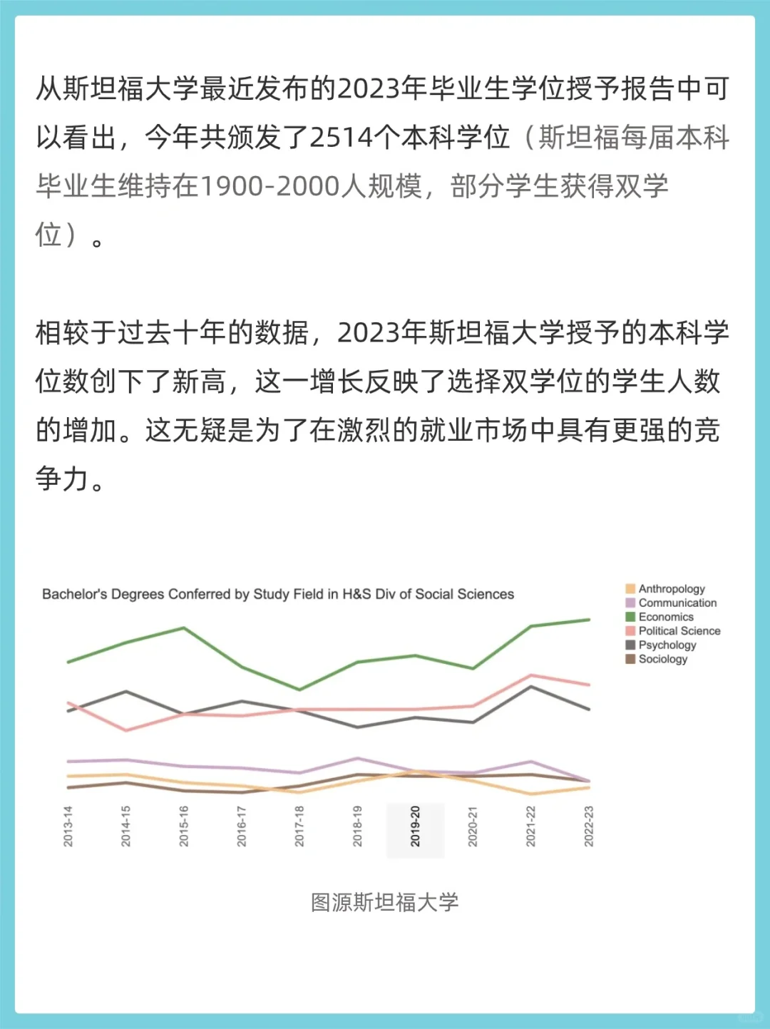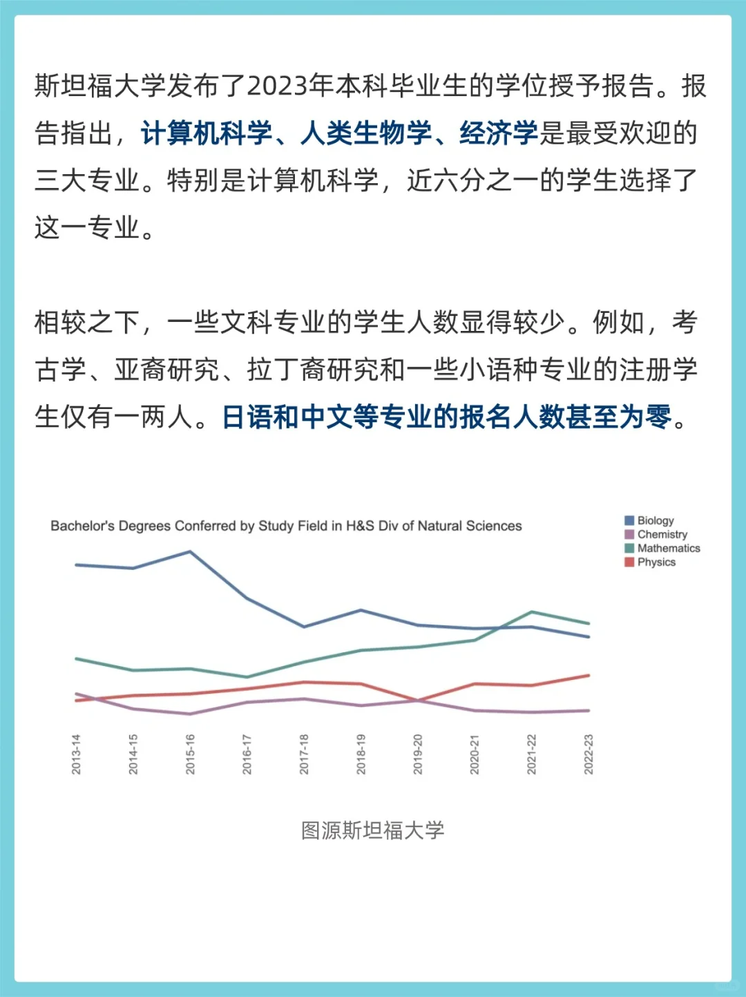 斯坦福大学发布了2023年本科毕业生的学位授予报告。报告指出,计算机科学、人类生物学、经济学是最受欢迎的三大专业。特别是计算机科学,近六分之一的学生选择了这一专业。