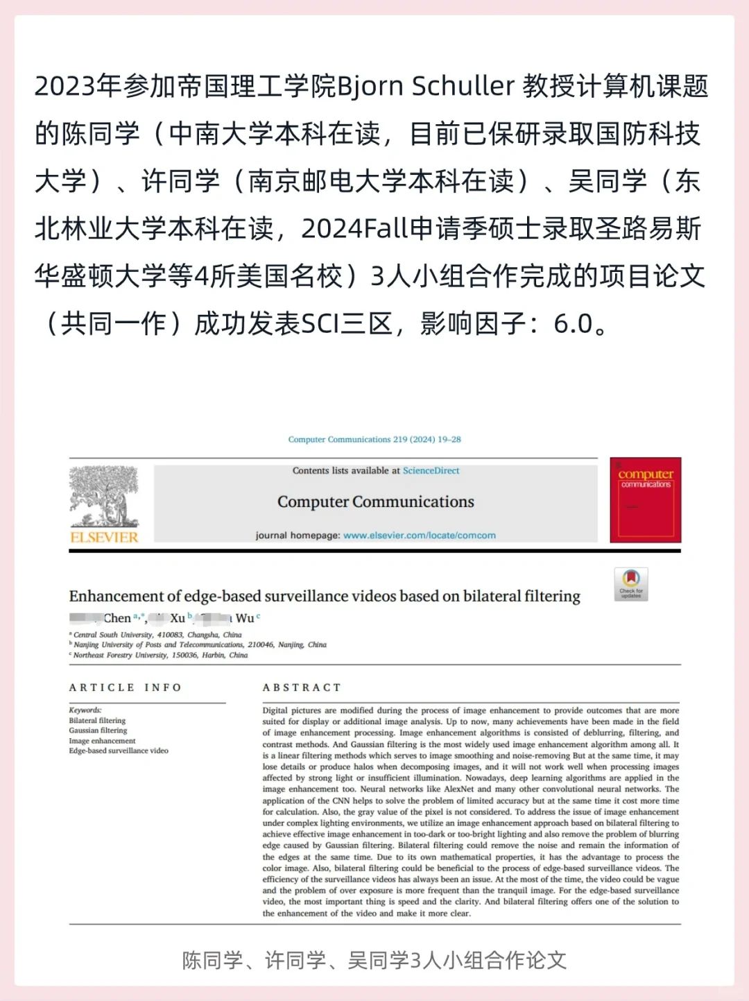 ✨2023年参加帝国理工学院Bjorn Schuller 教授计算机课题的陈同学(中南大学本科在读,目前已保研录取国防科技大学)、许同学(南京邮电大学本科在读)、吴同学(东北林业大学本科在读,2024Fall申请季硕士录取圣路易斯华盛顿大学等4所美国名校)3人小组合作完成的项目论文(共同一作)成功发表SCI三区,影响因子:6.0。