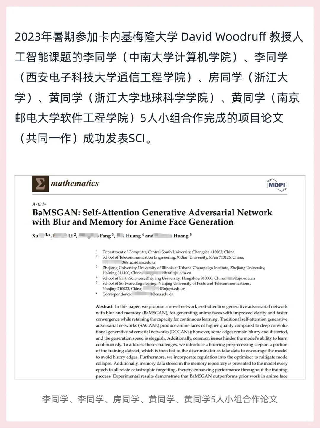 ✨2023年暑期参加卡内基梅隆大学 David Woodruff 教授人工智能课题的李同学(中南大学计算机学院)、李同学(西安电子科技大学通信工程学院)、房同学(浙江大学)、黄同学(浙江大学地球科学学院)、黄同学(南京邮电大学软件工程学院)5人小组合作完成的项目论文(共同一作)成功发表SCI。