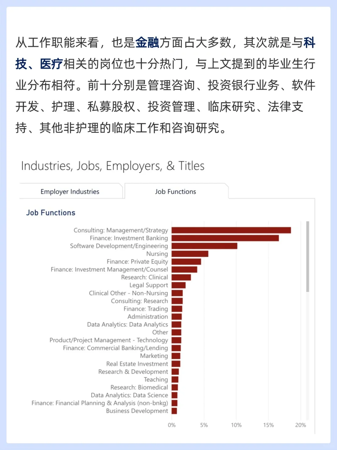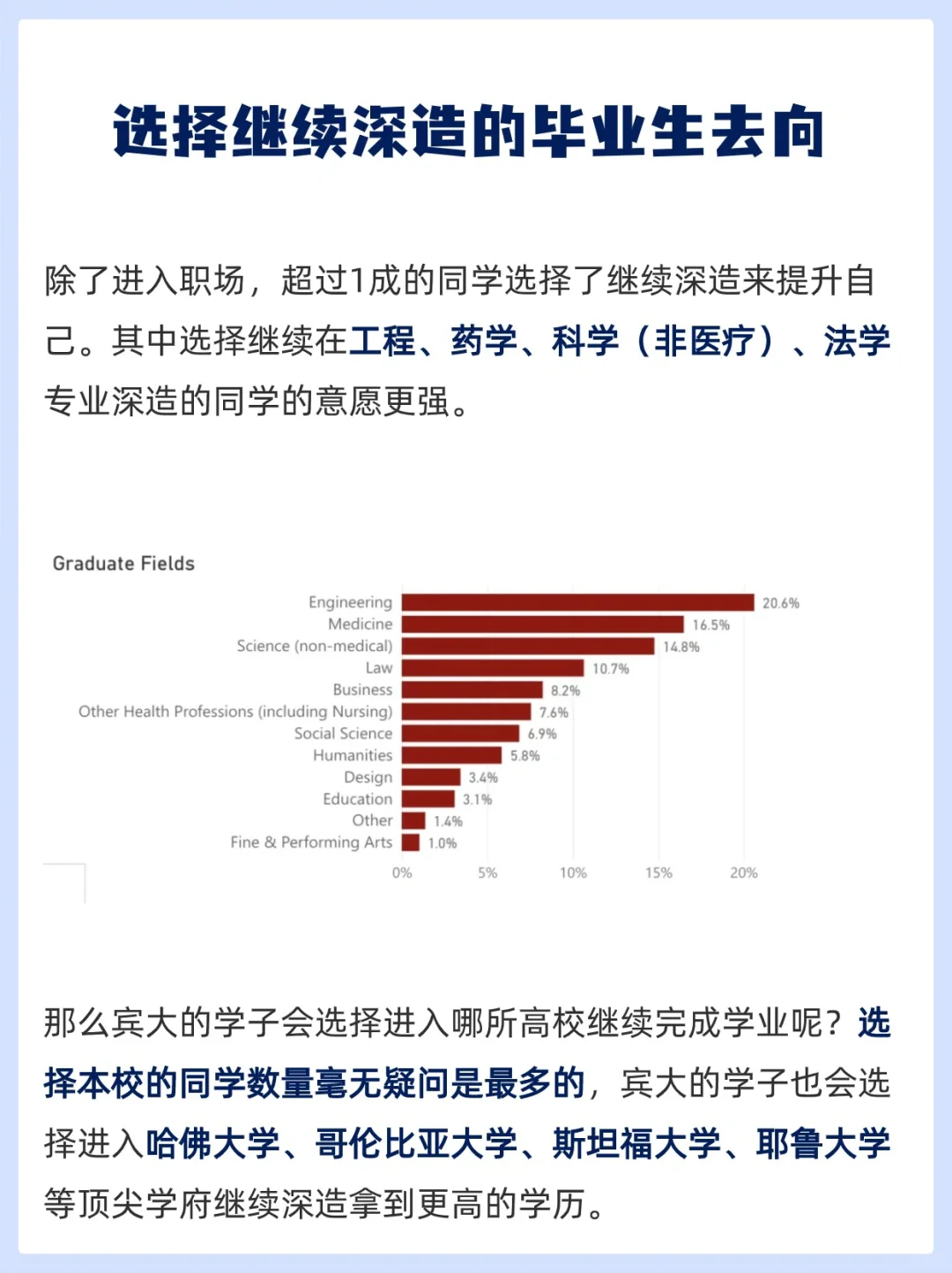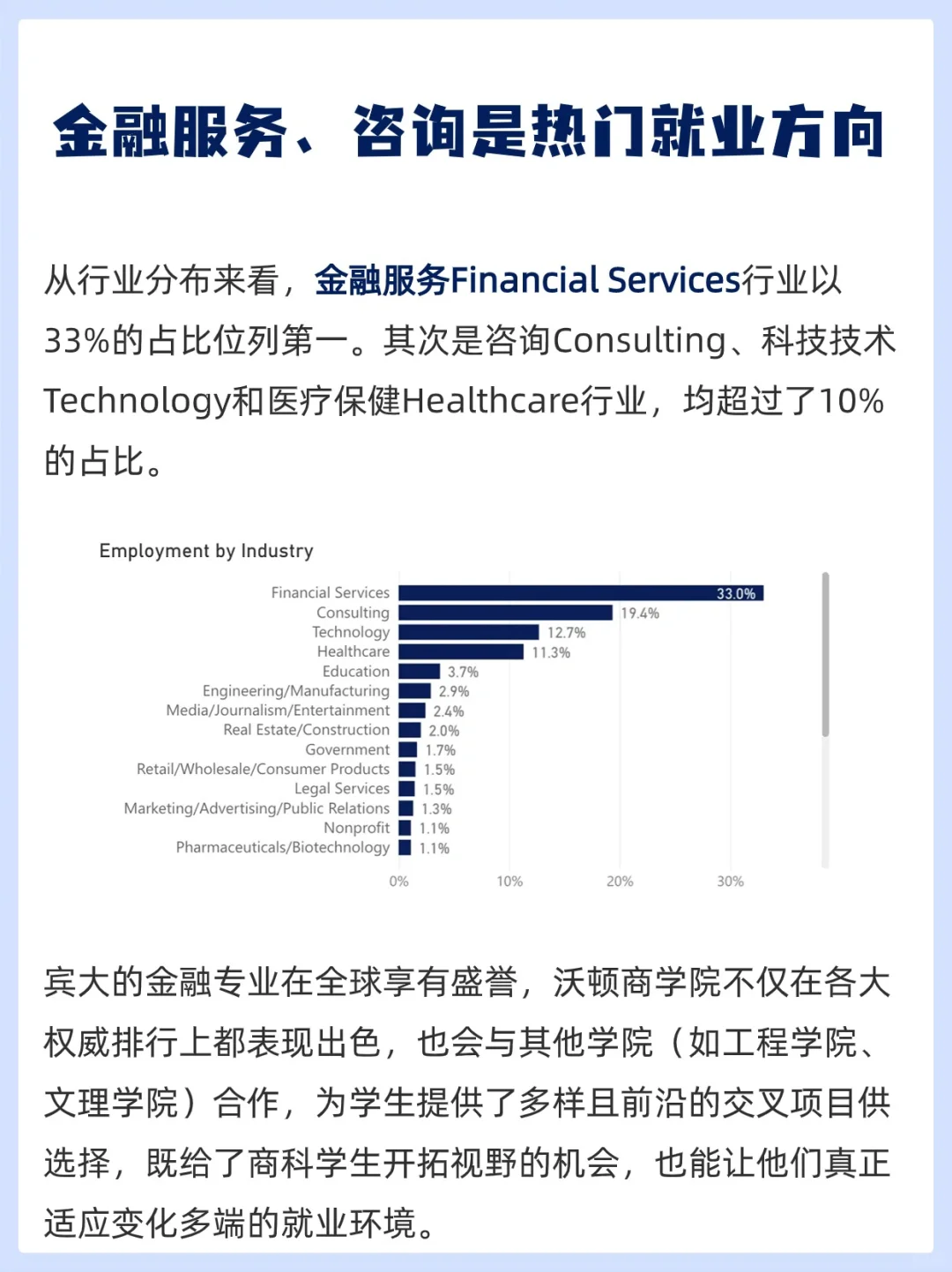 鉴于宾大在商学、医学、工程学等领域的强大实力,毕业生在金融、咨询、科技、医疗和制造等行业都有广泛的就业机会。