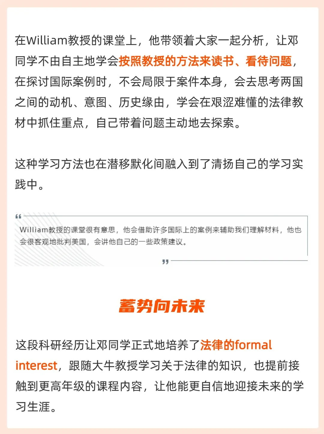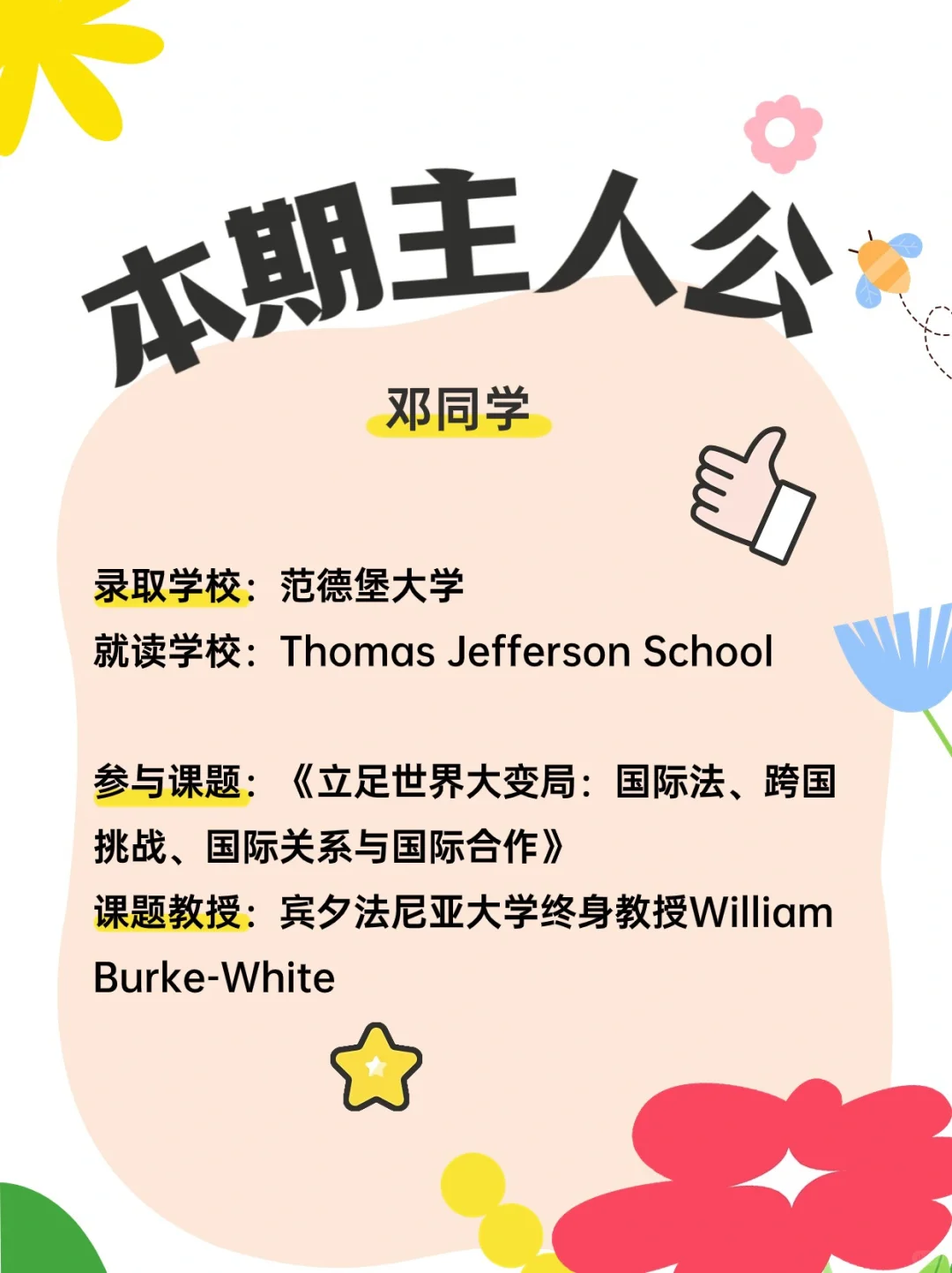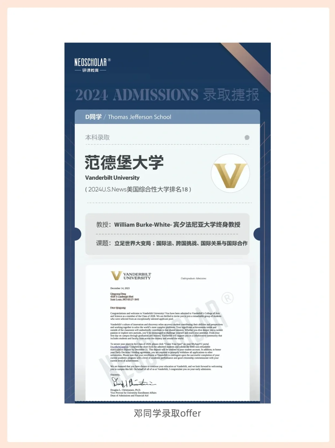 今天的专访主人公是邓同学,在申请季成功上岸范德堡大学。对法律感兴趣的他在申请前跟随宾夕法尼亚大学教授探索国际法律,让他能更自信地迎接未来的学习生涯。 接下来让我们来听听他的故事(见☝️图)。 - 这段科研经历让邓同学正式地培养了法律的formal interest,跟随大牛教授学习关于法律的知识,也提前接触到更高年级的课程内容,让他能更自信地迎接未来的学习生涯。 -