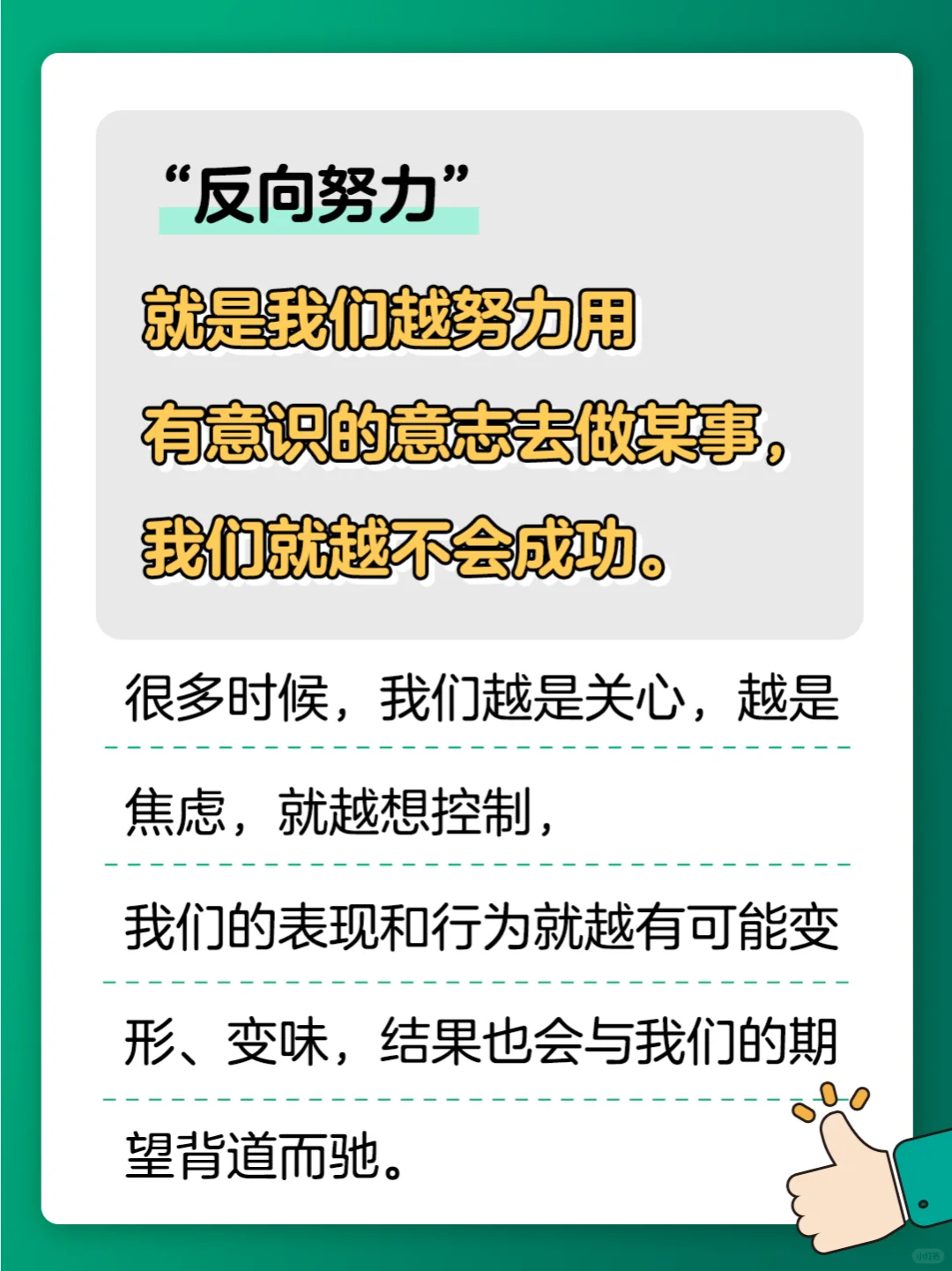 "反向努力"就是我们越努力用有意识的意志去做某事,我们就越不会成功。😓