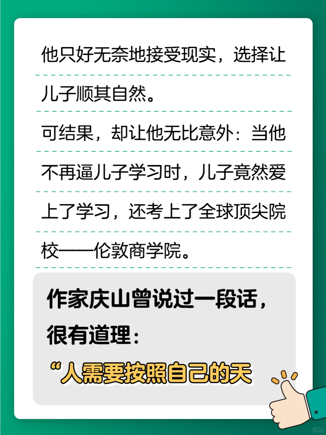可结果,却让他无比意外:当他不再逼儿子学习时,儿子竟然爱上了学习,还考上了全球顶尖院校——伦敦商学院。🎉