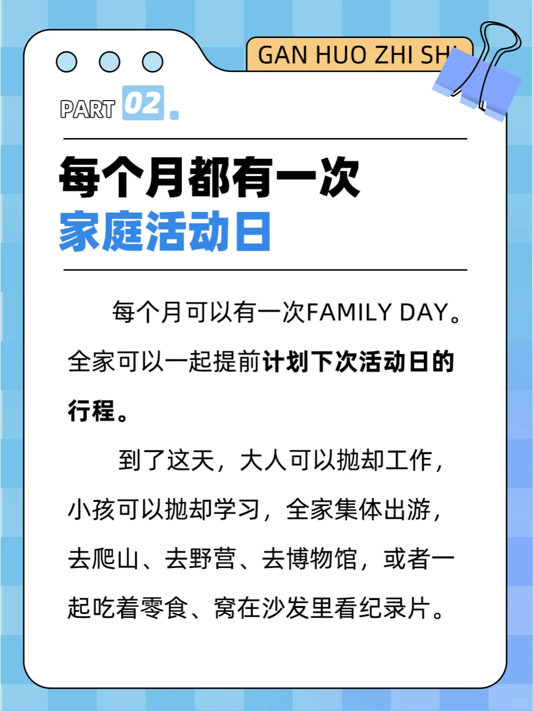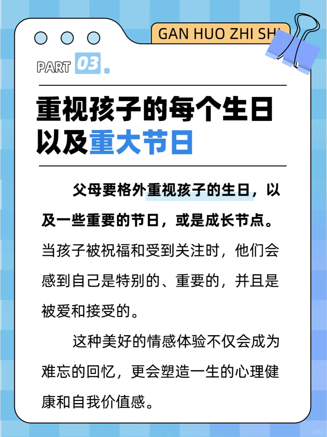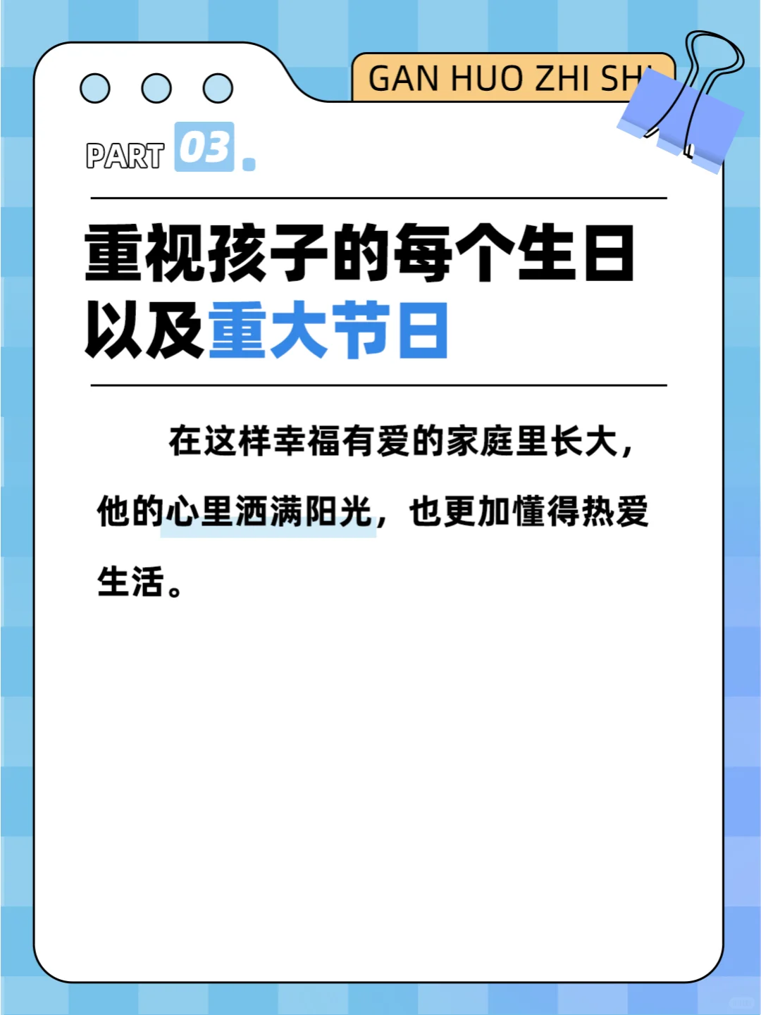1️⃣🎁每次重要考试后都要准备一份小礼物 2️⃣🎈每个月都有一次家庭活动日 3️⃣🎂重视孩子的每个生日以及重大节日🎉 4️⃣🏡每年带孩子回一次老家 5️⃣📸每年都和孩子拍照留念