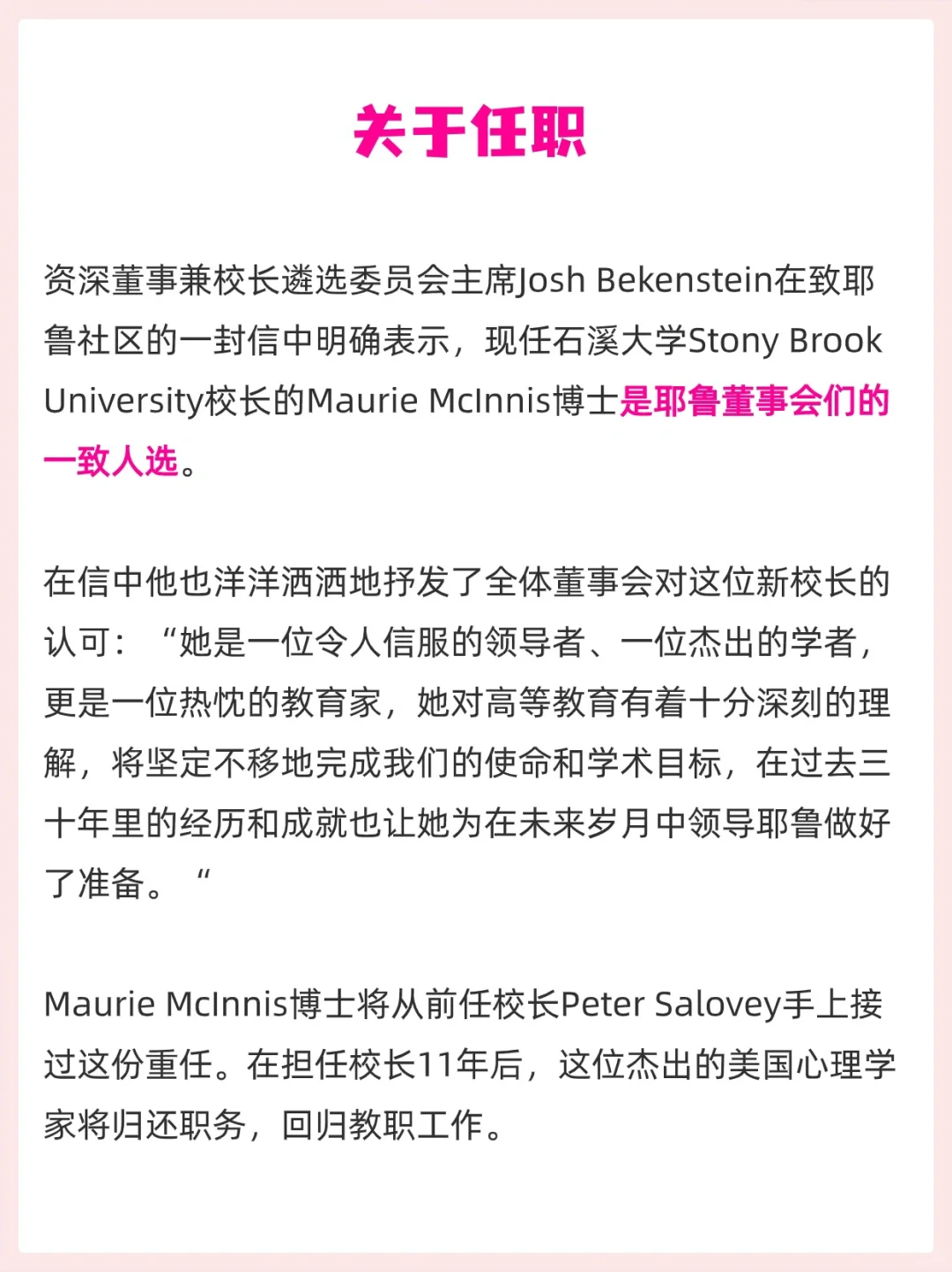资深董事兼校长遴选委员会主席Josh Bekenstein在致耶鲁社区的一封信中明确表示,现任石溪大学Stony Brook University校长的Maurie McInnis博士是耶鲁董事会们的一致人选。