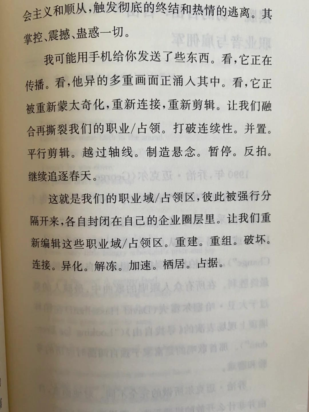 这一篇作者表达的是:“过去属于工作(work)的事越来越多地转变为职业(occupation)”——这一转变使经济框架及其对空间和时间性的影响全部发生变化,通过一些“占领”进行反思