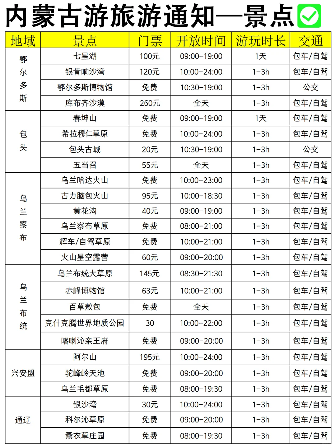 💥跟团游:比较适合打算玩🕑5-6天甚至想把精华景点打卡完的小伙伴,毕竟内蒙古的景点都分的很散,来回的交通以及住宿就很麻烦,♥对于第一次去的小伙伴更建议是跟个当地团出行,这样不仅不用操心住宿和交通,而且景点也不需要自己预约,真的很省事