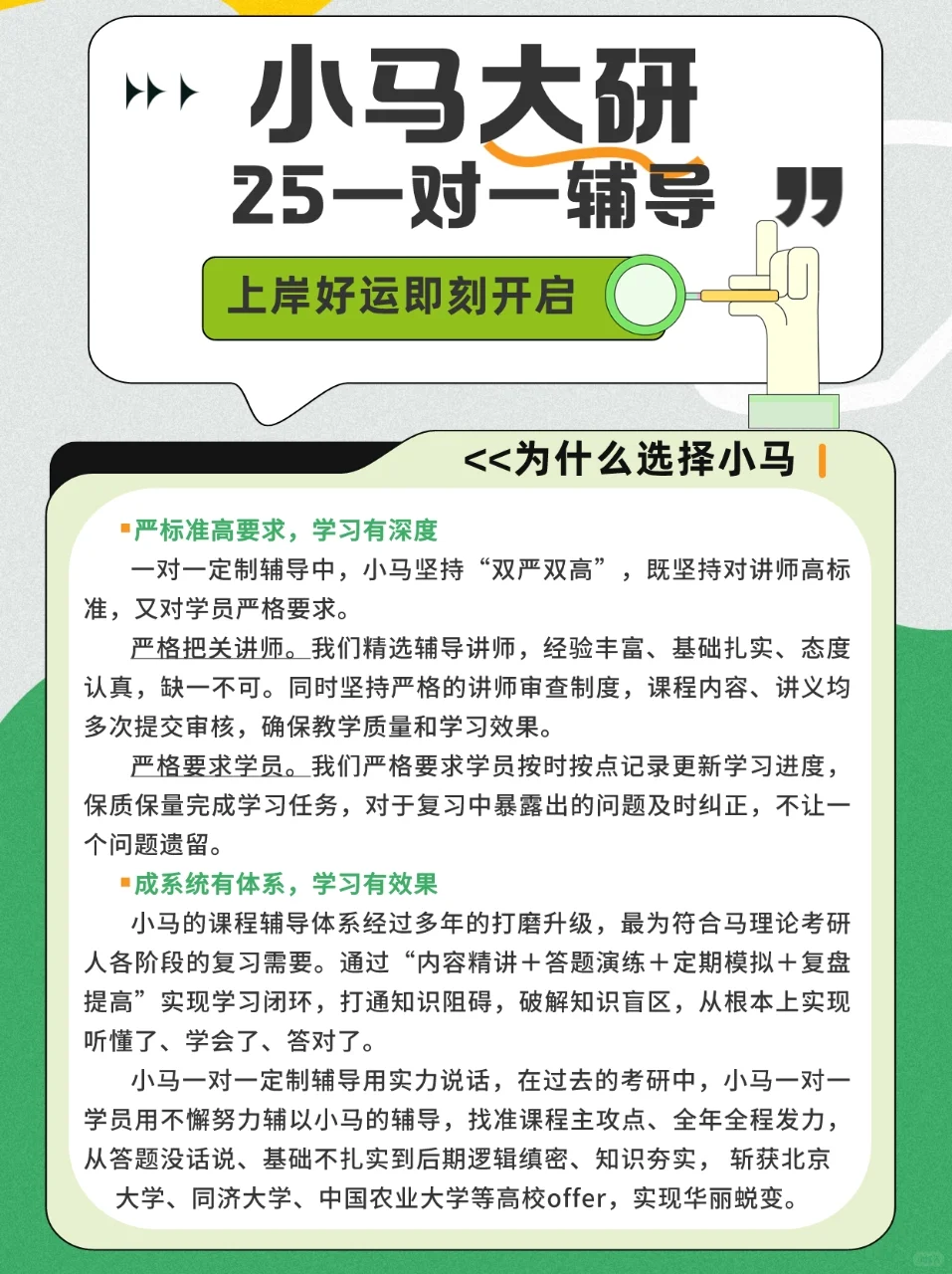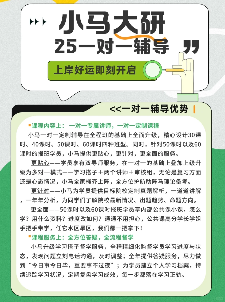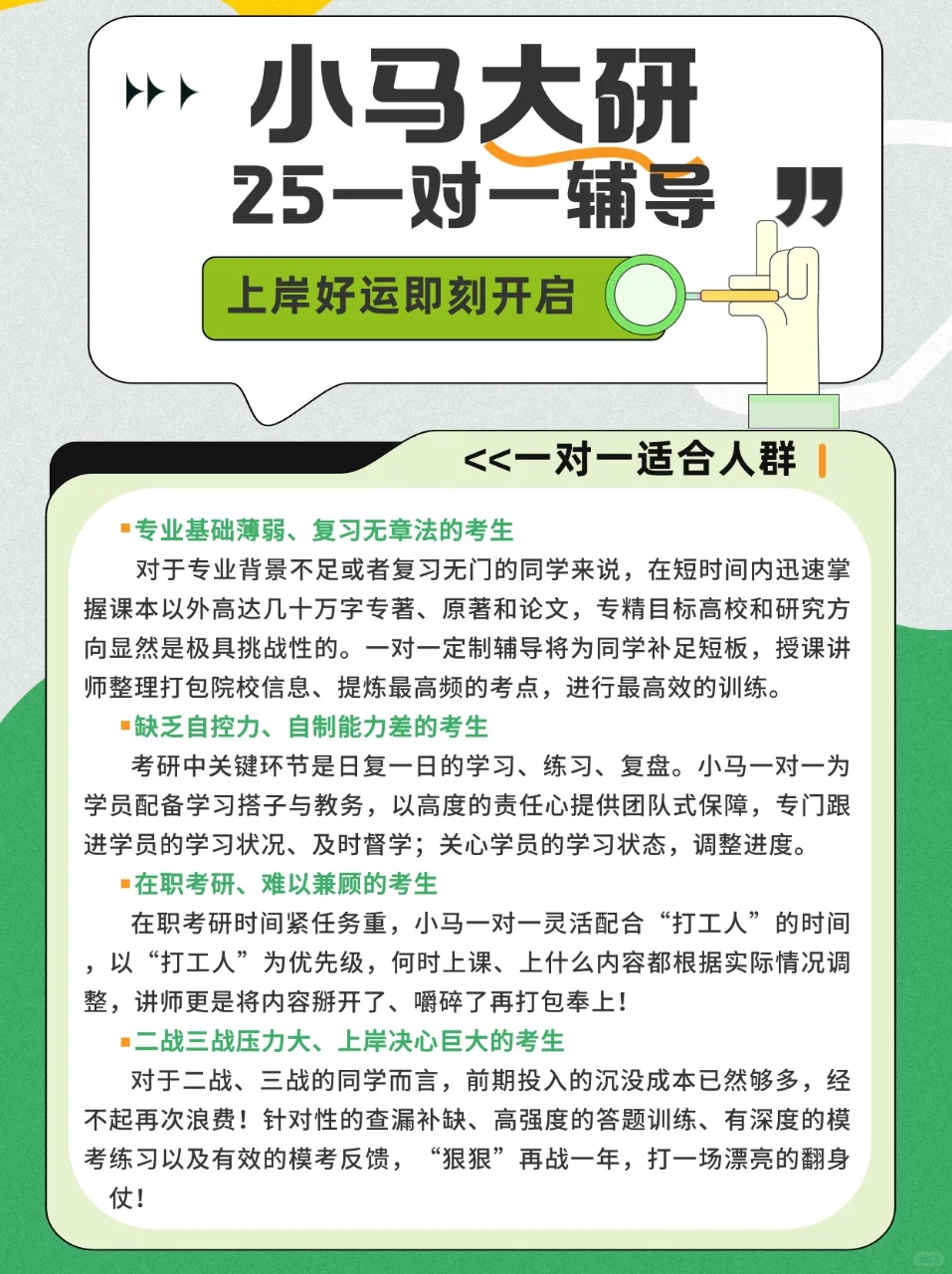 25“一对一定制辅导”是小马大研精心打造升级的臻品课程,“个性化”角度出发,定制专属备考方案,“一站式”解决“疑难杂症”。[举手R]