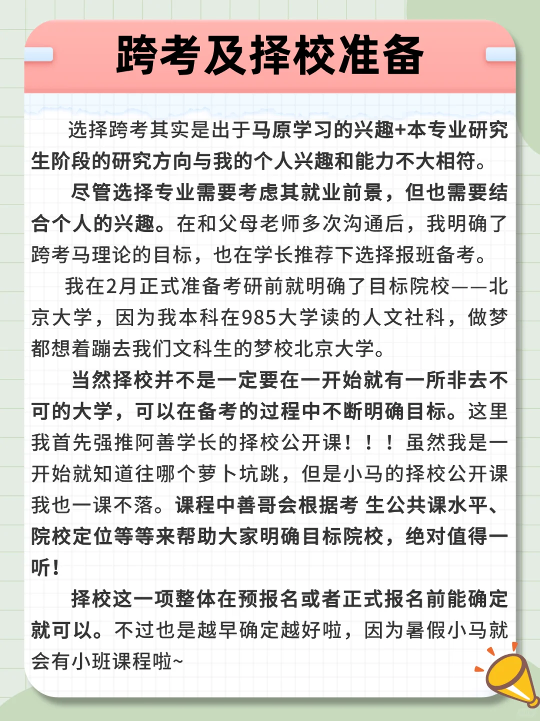 北大马院平台高、实力强,是众多马理论考研er心中的梦校[举手R][举手R][举手R] 小马特邀一战上岸北大马院的学姐,为大家分享自己的择校心路历程、各阶段公共课和专业课备考方法,备考时间安排![微笑R] 希望在观摩大神的备考计划后获得不一样的启发[害羞R][害羞R]