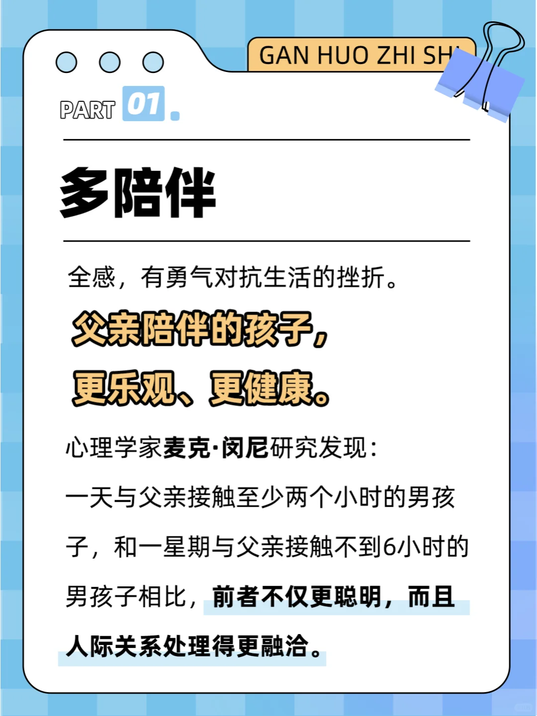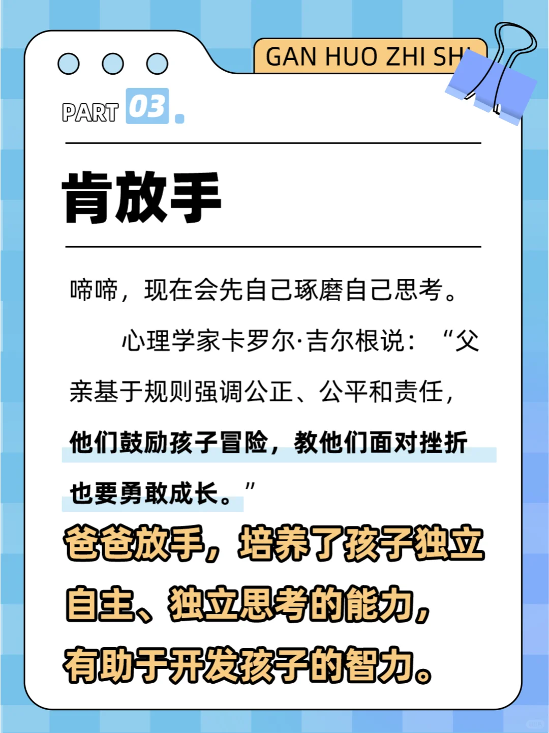 著名的心理学家格尔迪说:“父亲是一种独特的存在,对培养孩子有一种特别的力量。”💡