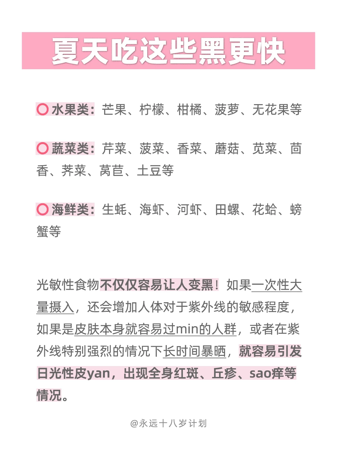 不是说这些食物夏天绝对不能吃,别一次性吃太多就行,而且吃完后千万不要在强光下活动,喜欢吃这些食物可以晚上多吃~