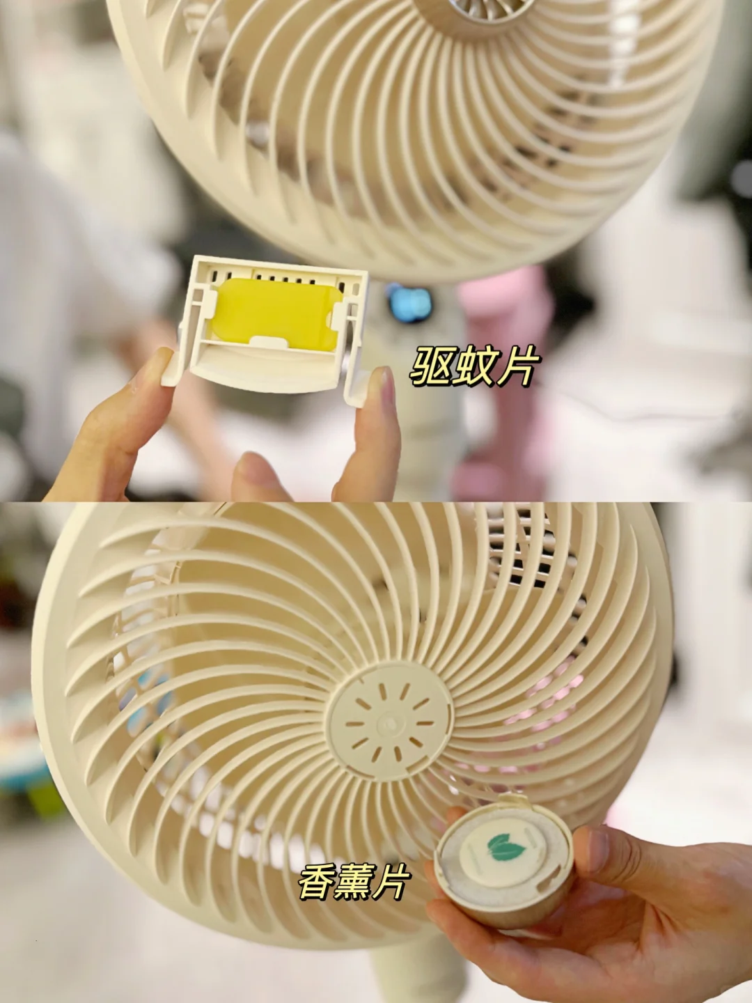〰️小惊喜的是,还可以放置香薰片/防蚊片(买的时候会送哦)。开风扇后,能防蚊虫,净化空气。还是很贴心的…