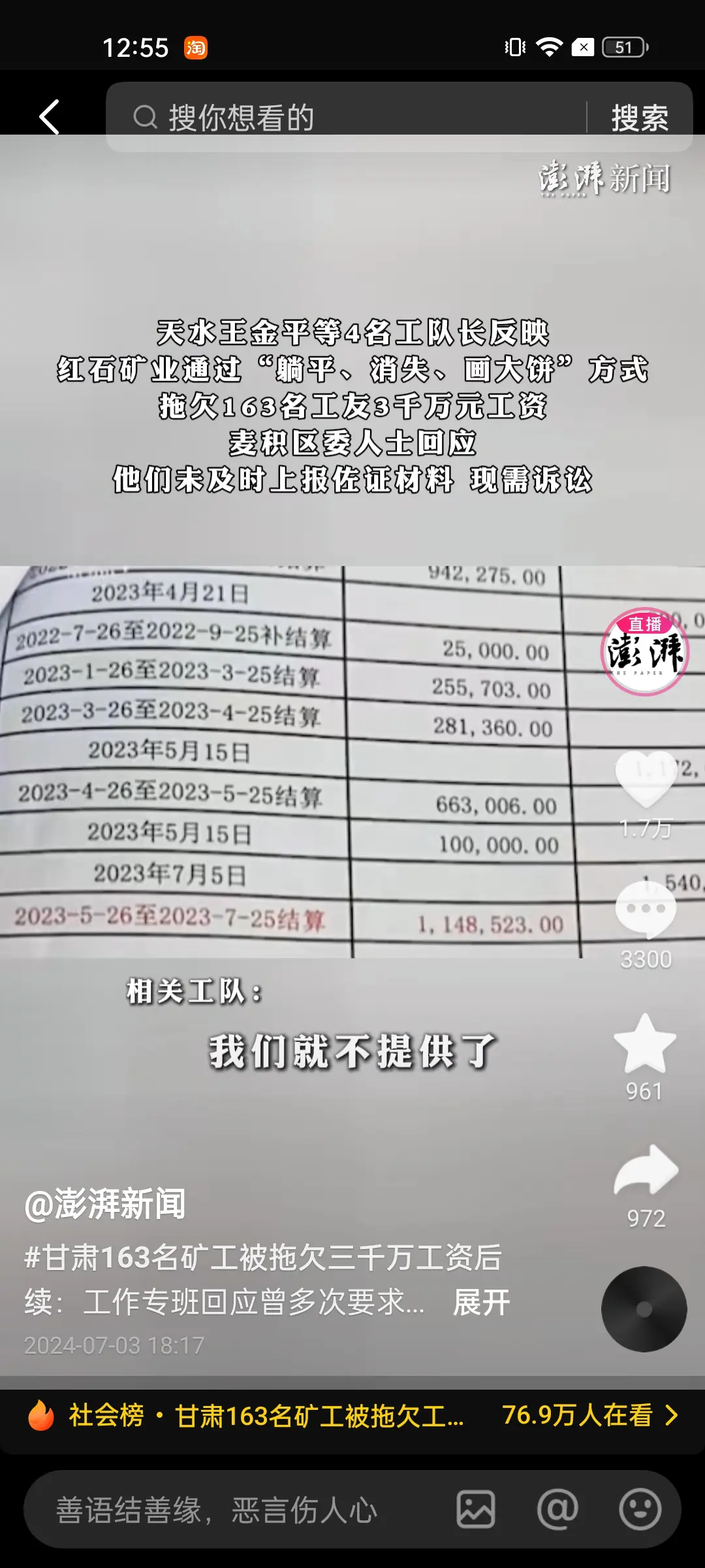 近日,麦积区委负责同志表示,去年8月,红石矿业因矿权拍卖、矿区查封引发工人讨薪,区里就此成立工作专班。当时调解确认红石矿业欠薪232人4100余万元。 今年2月底,按照比例兑付了工人工资,将一笔协调资金发放完毕。 关于王金平等4人情况,麦积区委负责同志表示,去年9月,工作专班督促欠薪工队提供花名册、考勤表等佐证材料。但王金平等4个工队未提供,办案员明确告知,限期不予上报材料视为“自动放弃”。 当时4人均表示知晓,也没有提出异议,直至近期再提出诉求。 麦积区委负责同志表示,王金平等4个工队和红石矿业之间系工程承包关系,不属于劳动保障及人事仲裁的受案范围,现今他们需要通过诉讼方式追偿承包款。