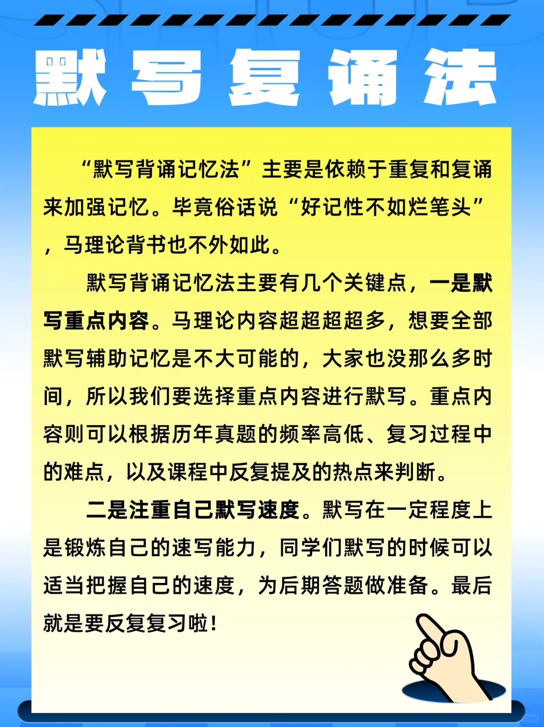临近6月,许多25考研er已经开启了背书的漫漫征程。对于马理论而言,专业课内容庞杂,术语多专业性强,背诵要求高,背了忘背了又忘![哭惹R][哭惹R][哭惹R][哭惹R] 小马跟大家分享几个大多数同学采用的方法,同学们可以在现在背诵压力还不是特别大的时候,慢慢摸索除适合的背书方法,不断调整找到最高效的背书状态![哇R][哇R][哇R]