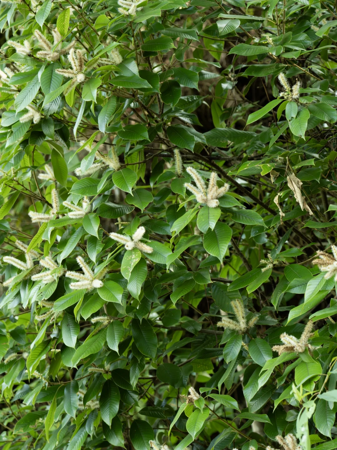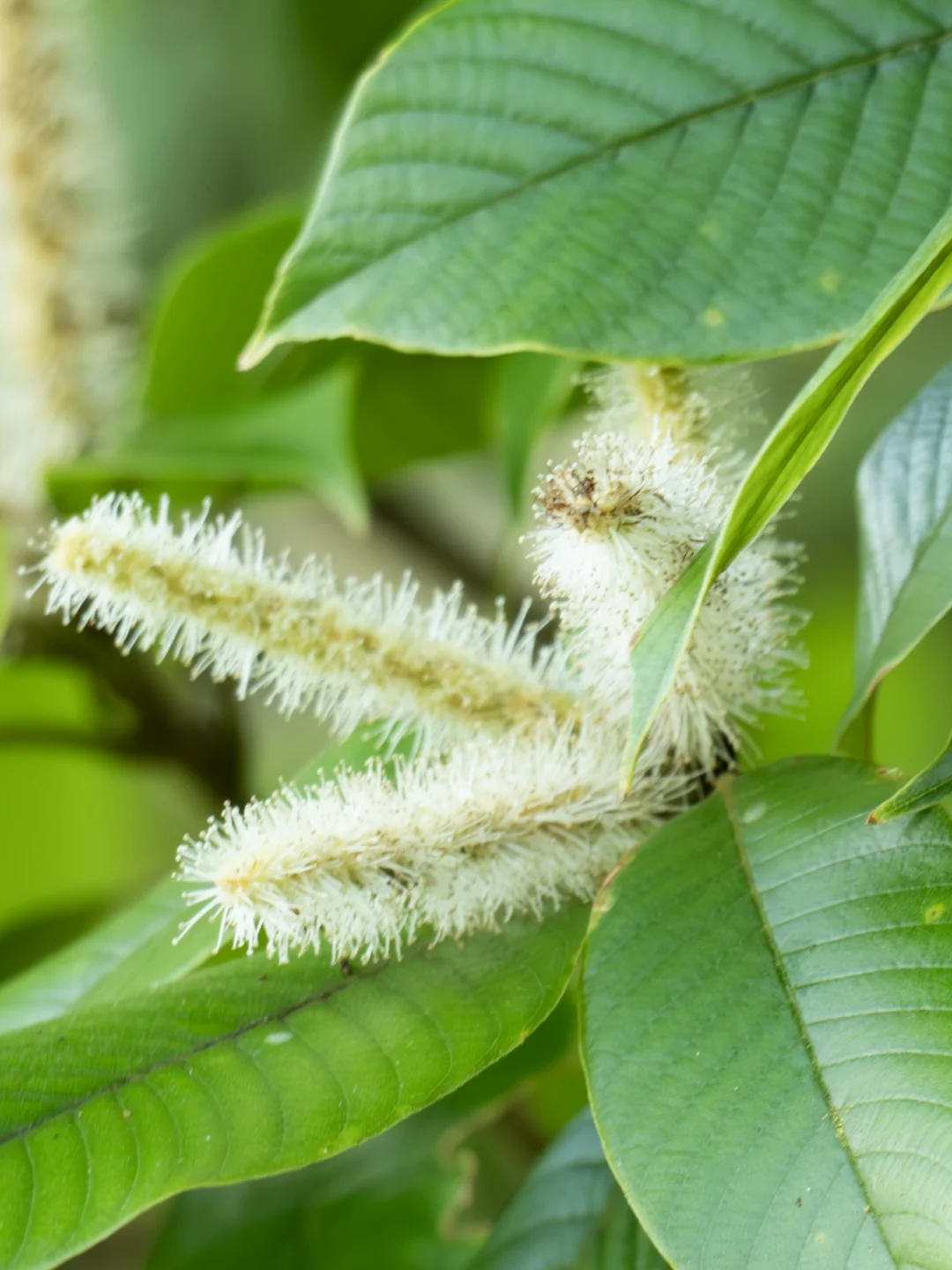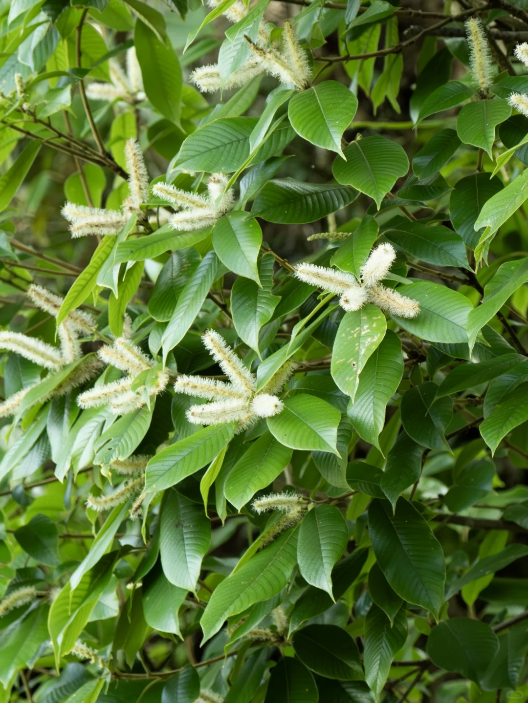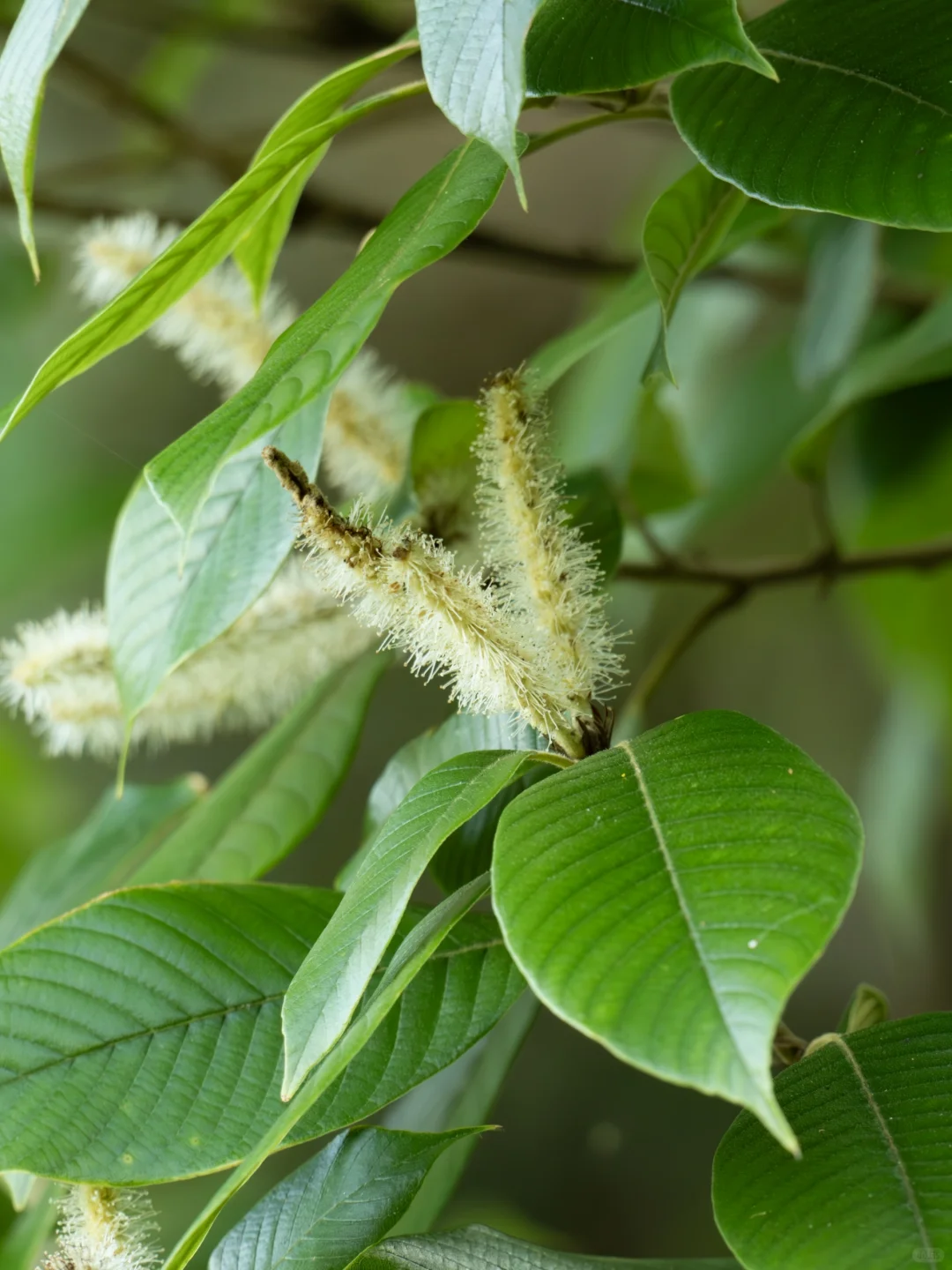 紫玉盘柯的花序轴粗壮,雄花序如穗状,单独或成簇聚生于枝顶,仿佛一簇簇点缀在树冠上的星星。而雌花则常生于雄花序轴的基部,每3朵一簇,有时单朵散生,花柱长达3毫米,无毛,清新素雅,独具韵味。