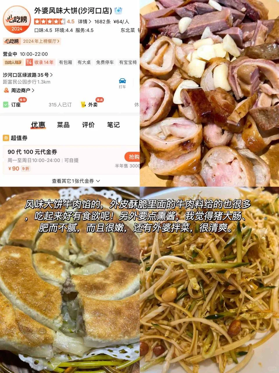 饼如其名!外皮酥脆内陷多到要溢出来啦‼️掰开来吃真的太有食欲感啦,另外一定要点熏酱拼盘,肥肠、猪蹄、豆腐皮等等,这个肥肠肥而不腻,特别有嚼劲,还可以试试外婆拌菜,特别清爽👌