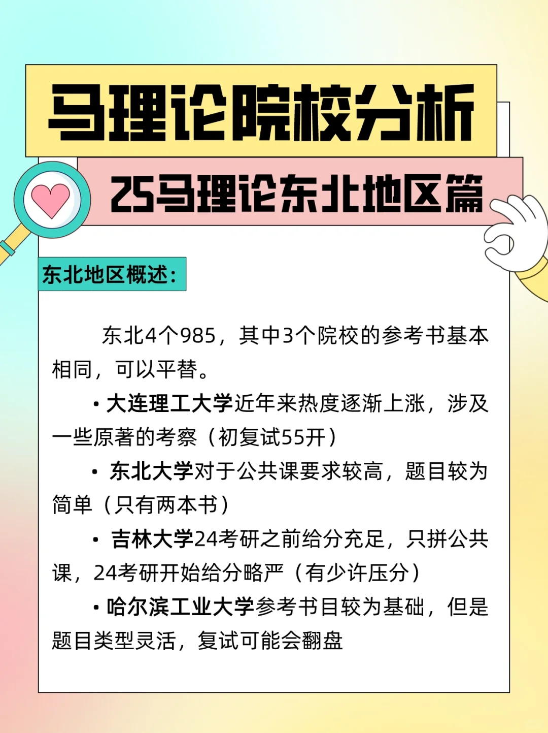 马理论直播带”校”第一期已经结束啦~[哇R] 小马给大家汇总了东北地区的院校情况,方便大家根据自身情况挑选![举手R][举手R][举手R]双非院校由于篇幅原因,咱们下期再跟大家说道说道~