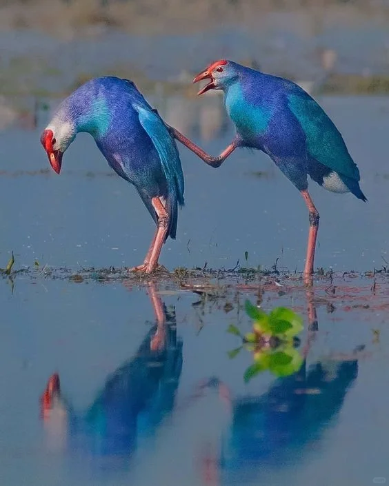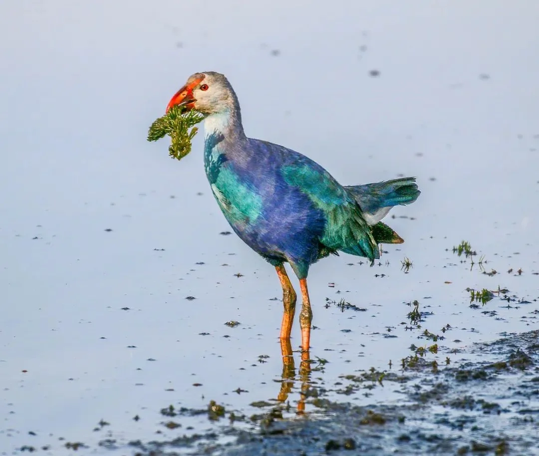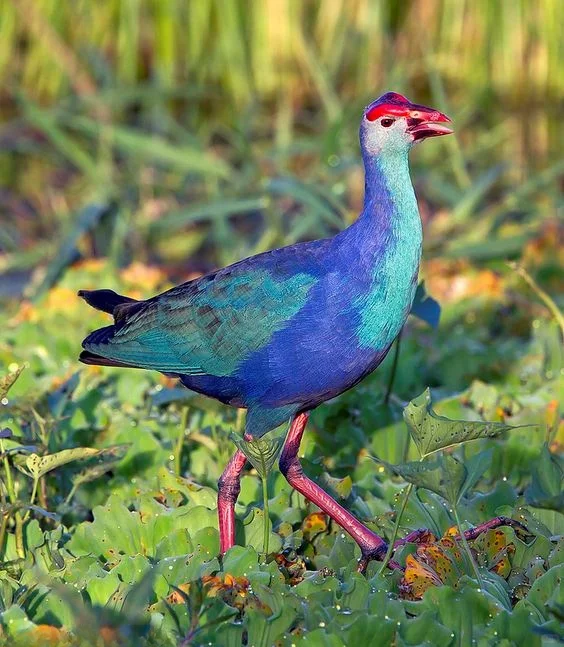 🍀形态特征:紫水鸡是秧鸡科紫水鸡属鸟类。下辖12个亚种,中国为云南亚种。体长40-45厘米,体羽大多为紫蓝色,翅表面和胸蓝绿色;尾下覆羽白色;嘴红色,粗大并与橙红色额甲相接;额甲宽阔,后缘呈截平状;雌雄鸟相似,雌鸟额甲稍小;虹膜棕红色;跗跖和趾深肉色,爪黄褐色。