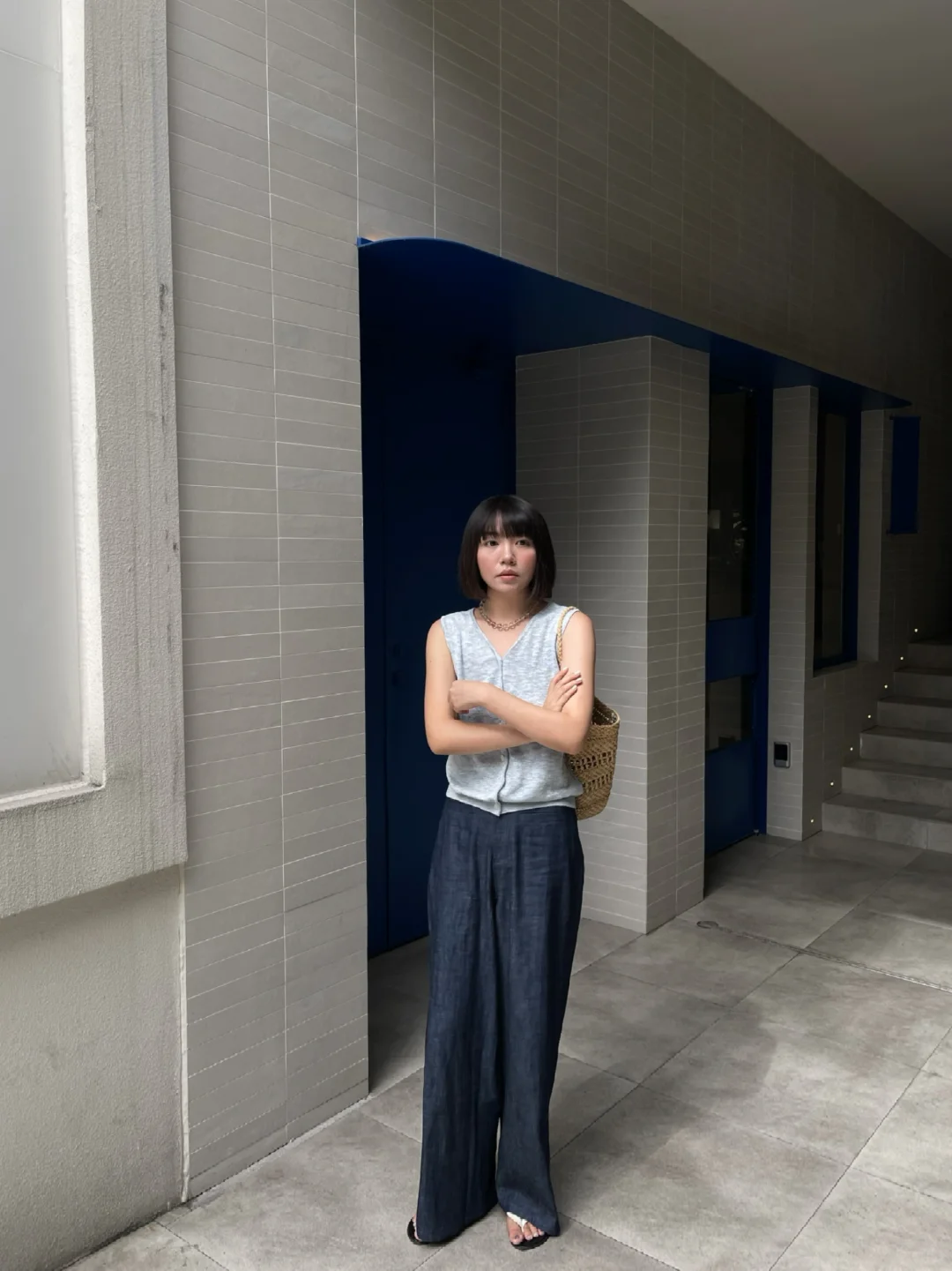 少女清新穿搭,黄色吊带裙搭配米色长裤,轻松惬意。
