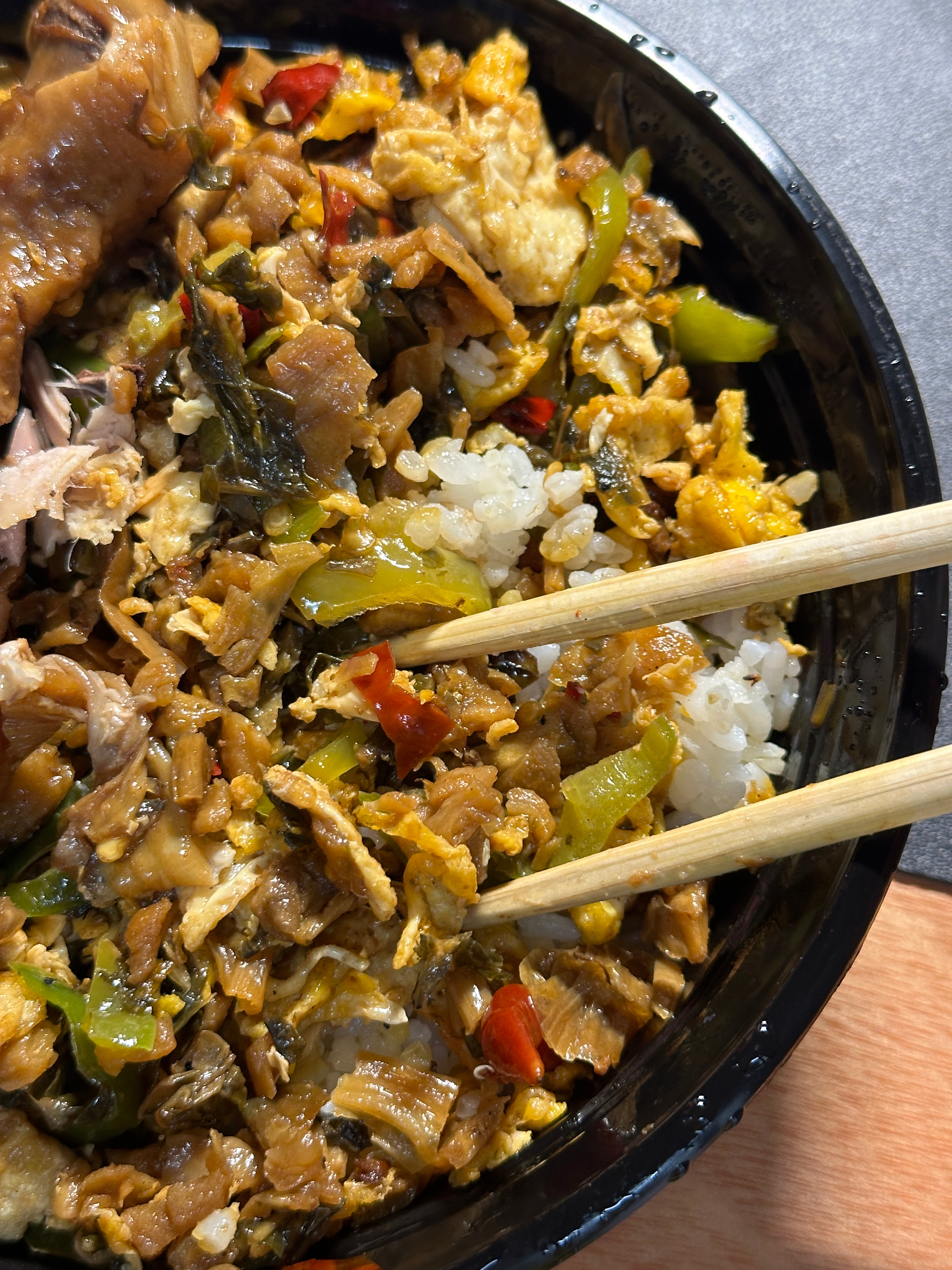 新发现一家盖饭!点了个外婆菜鸡蛋,竟然是甜口的😲量还巨大,扒拉了半天才看到米饭。鸡腿也是蜜汁口味,腻了[泪]