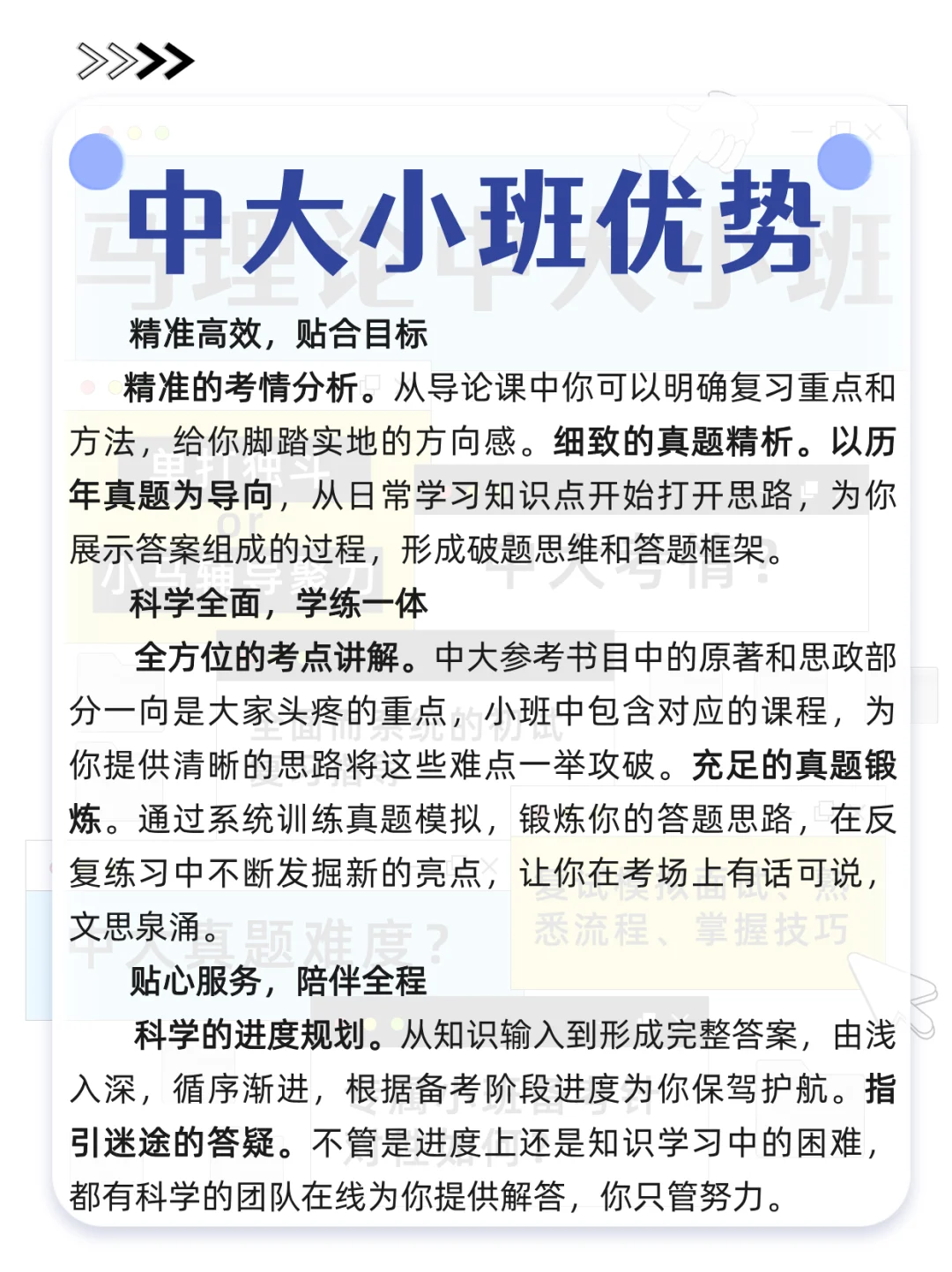 中大小班邀请高分上岸、经验丰富的学姐担任小班主任,针对院校出题风格和考察重点设计课时和补充内容,拆解厚厚的教材,整合琐碎知识,使长长的参考书目清单不再成为你的痛点,顺里上岸中大,来年双鸭山见![哇R][哇R][哇R]